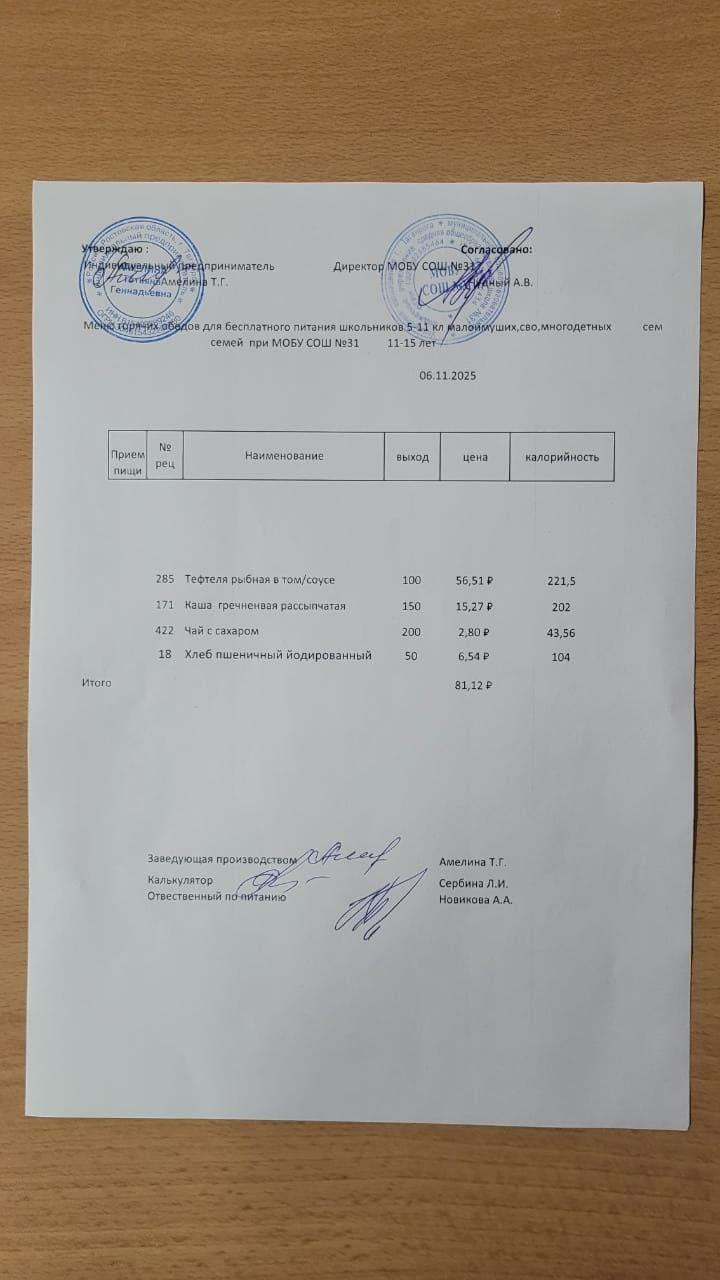Ежедневное меню бесплатного горячего питания школьников 5 - 11 классов при МОБУ СОШ № 31 от 06.11.2025г..