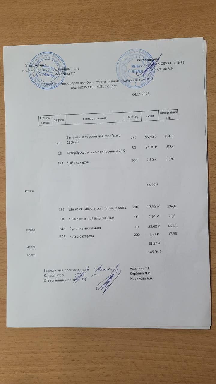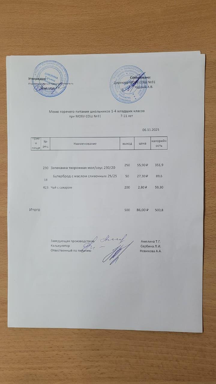 Ежедневное меню бесплатного горячего питания школьников 1-4 классов при МОБУ СОШ № 31 от 06.11.2025г.