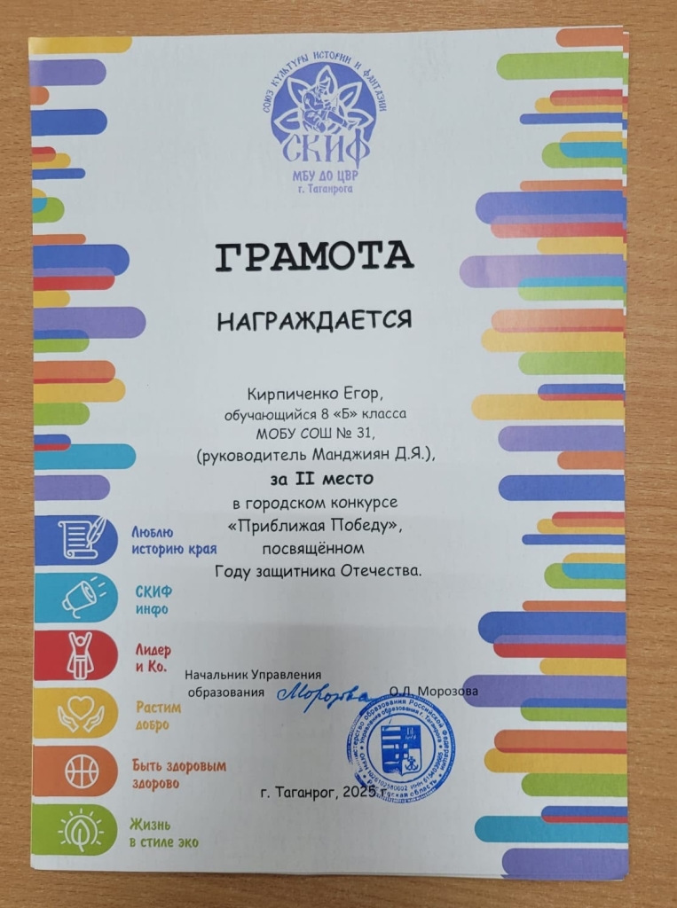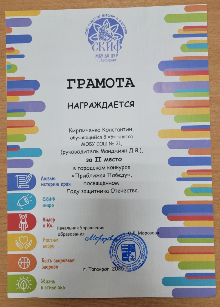 Обучающиеся 8 "Б" класса приняли участие в конкурсе статей от городской организании СКИФы "Приближая победу!".