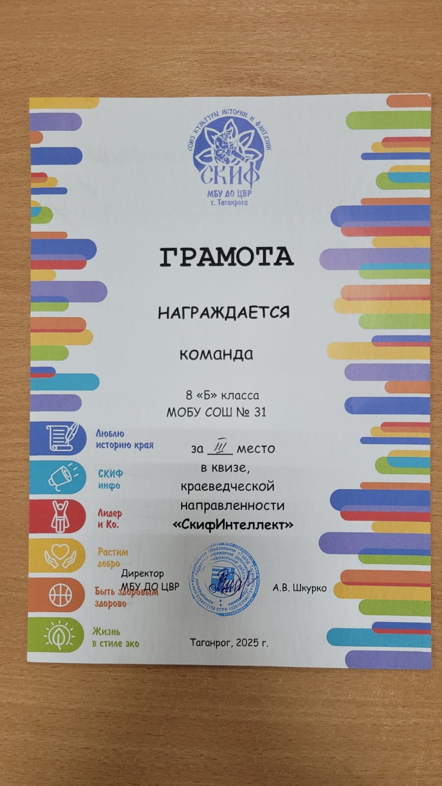 А также команда 8 "Б" класса заняла 3 место в игре "Скиф-интеллект".