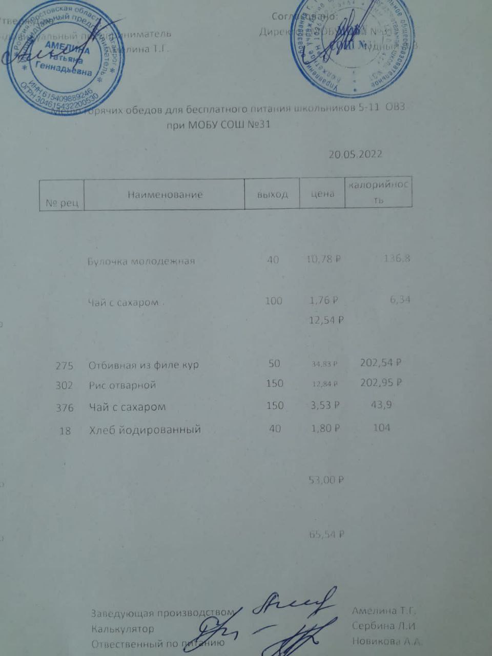 Ежедневное меню бесплатного горячего питания школьников 1 - 4 классов с ОВЗ при МОБУ СОШ № 31 от 20.05.2022г..