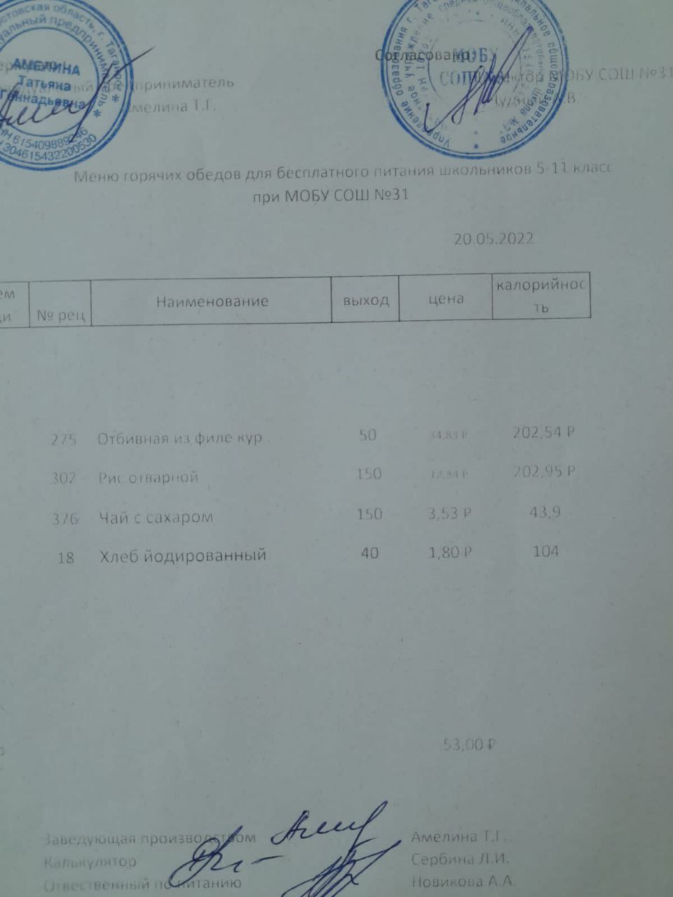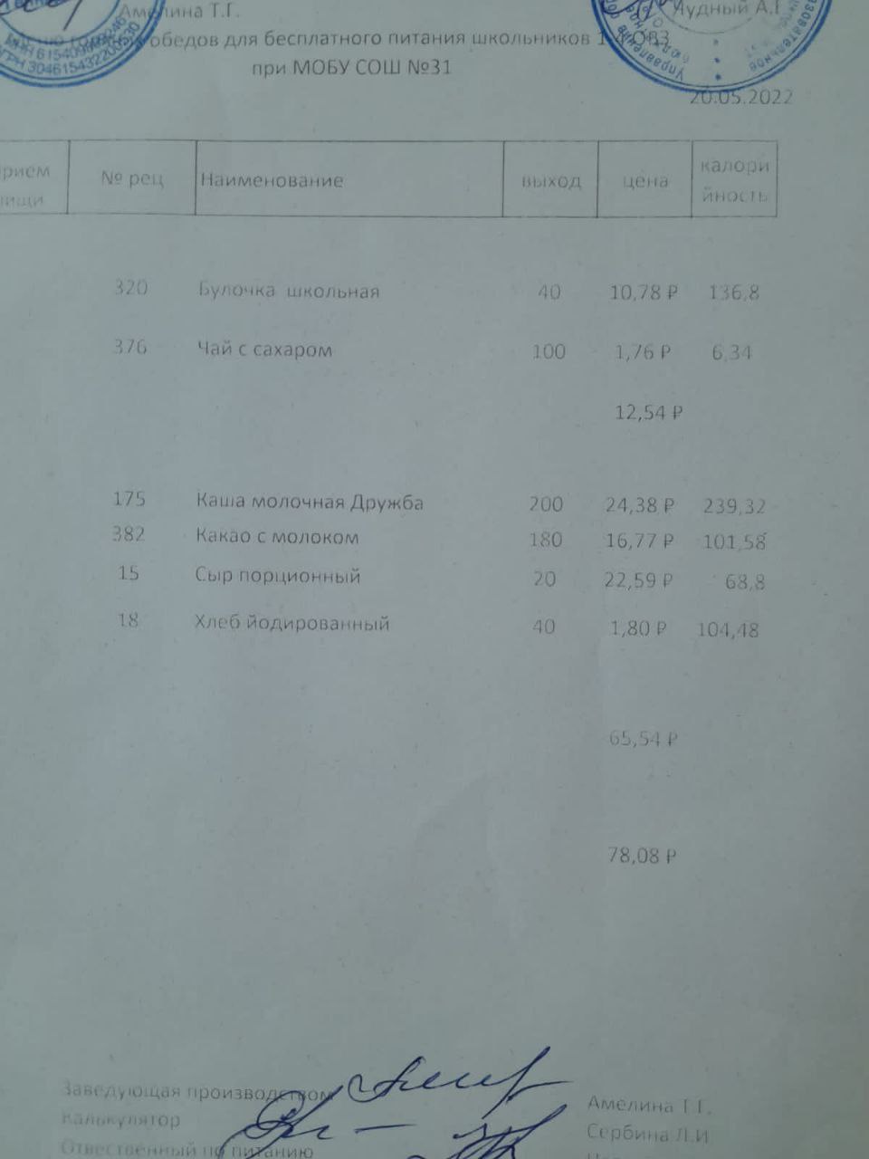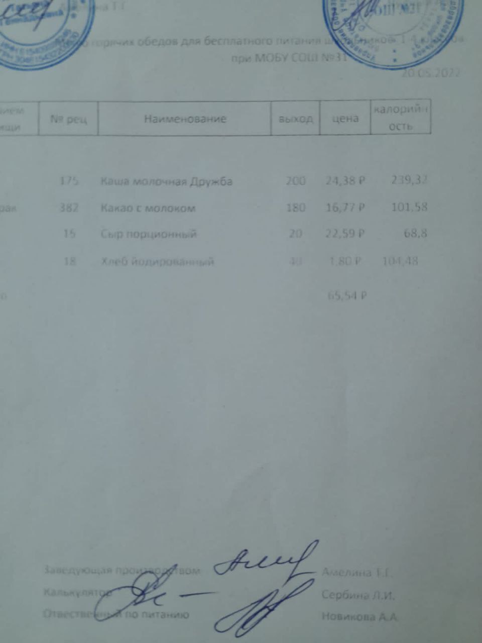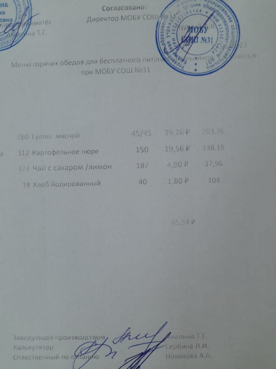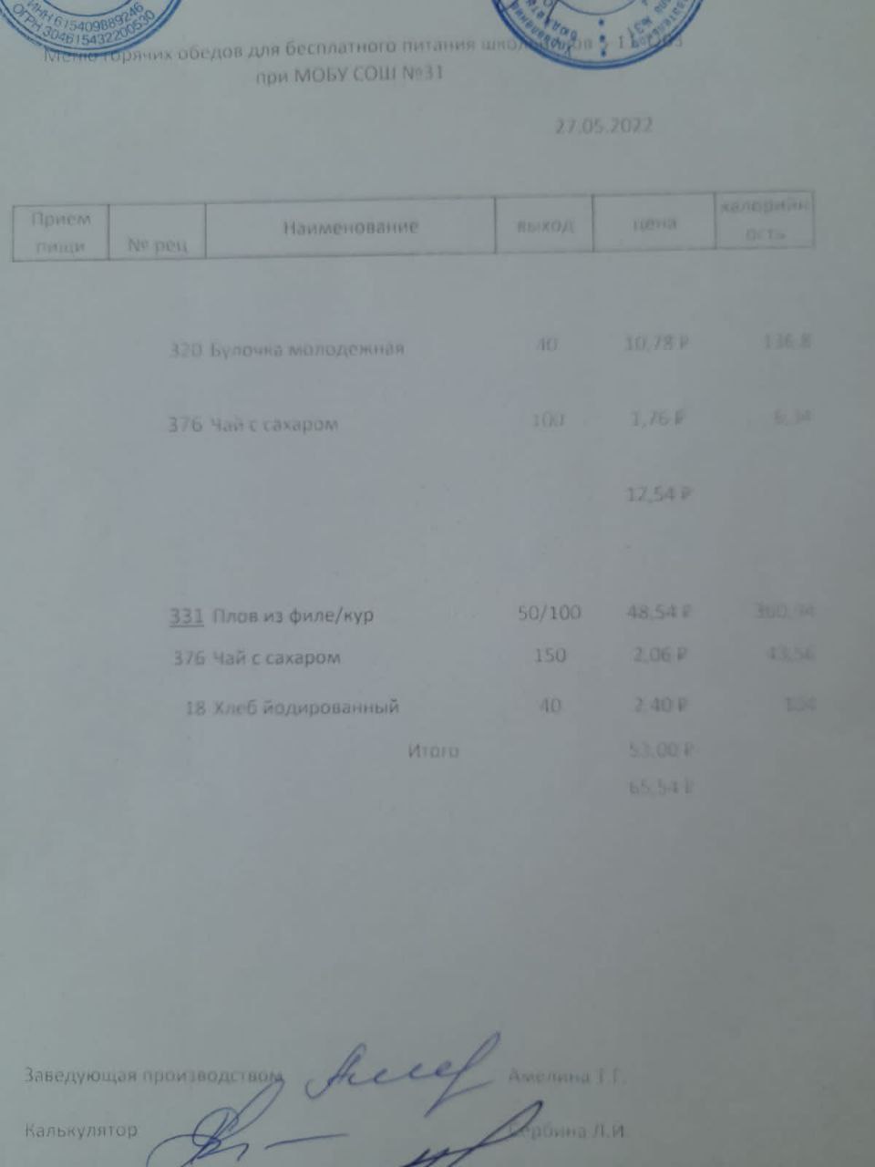 Ежедневное меню бесплатного горячего питания школьников 1-4 классов при МОБУ СОШ № 31 от 20.05.2022г.
