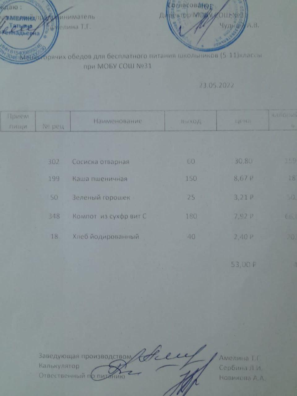 Ежедневное меню бесплатного горячего питания школьников 5 - 11 классов с ОВЗ при МОБУ СОШ № 31 от 23.05.2022г.