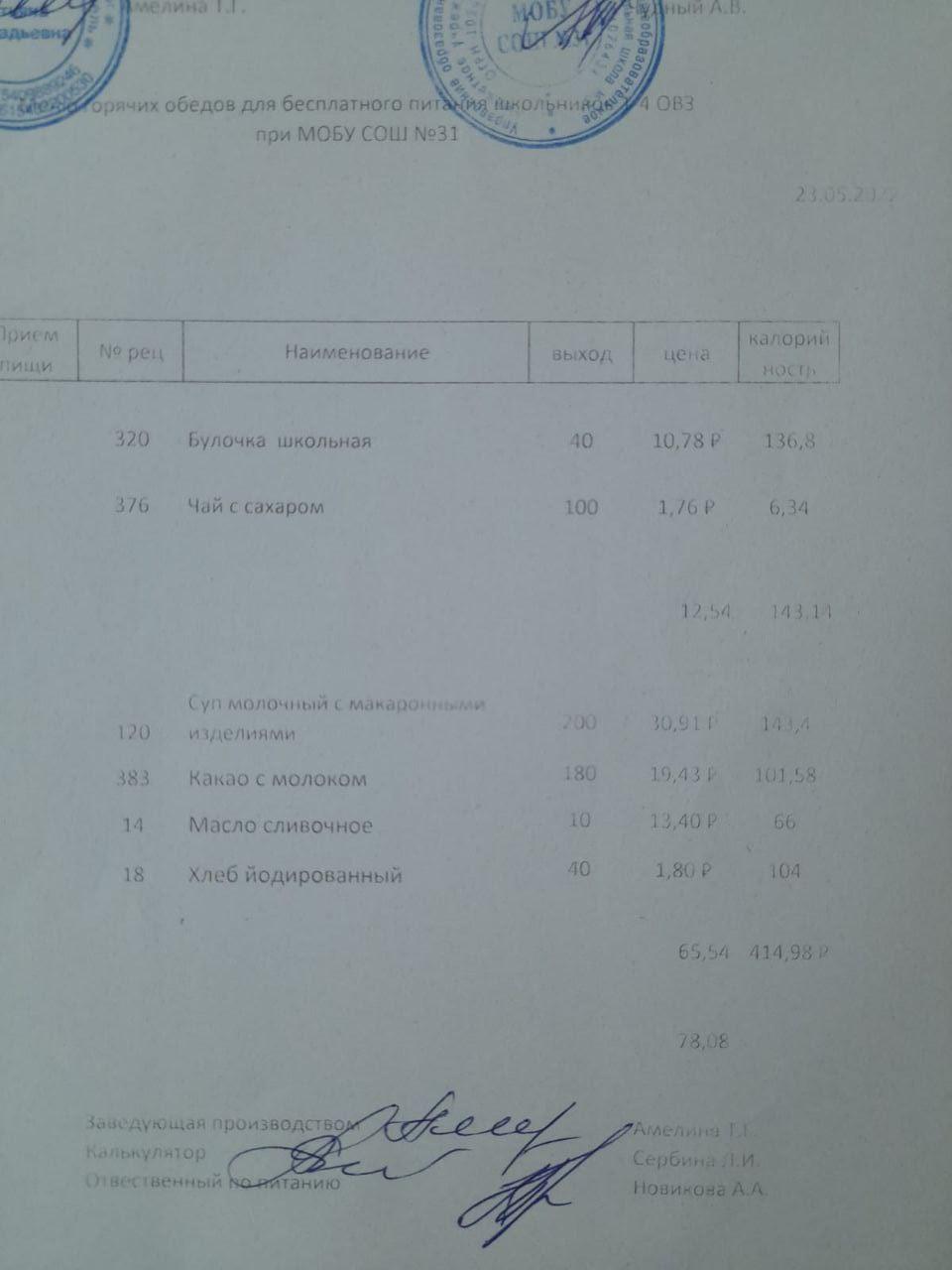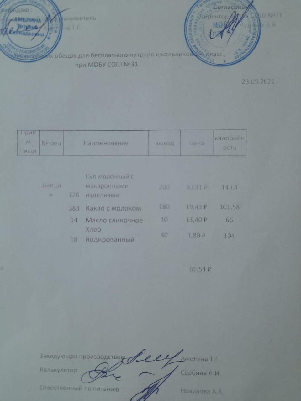 Ежедневное меню бесплатного горячего питания школьников 1 - 4 классов с ОВЗ при МОБУ СОШ № 31 от 23.05.2022г..