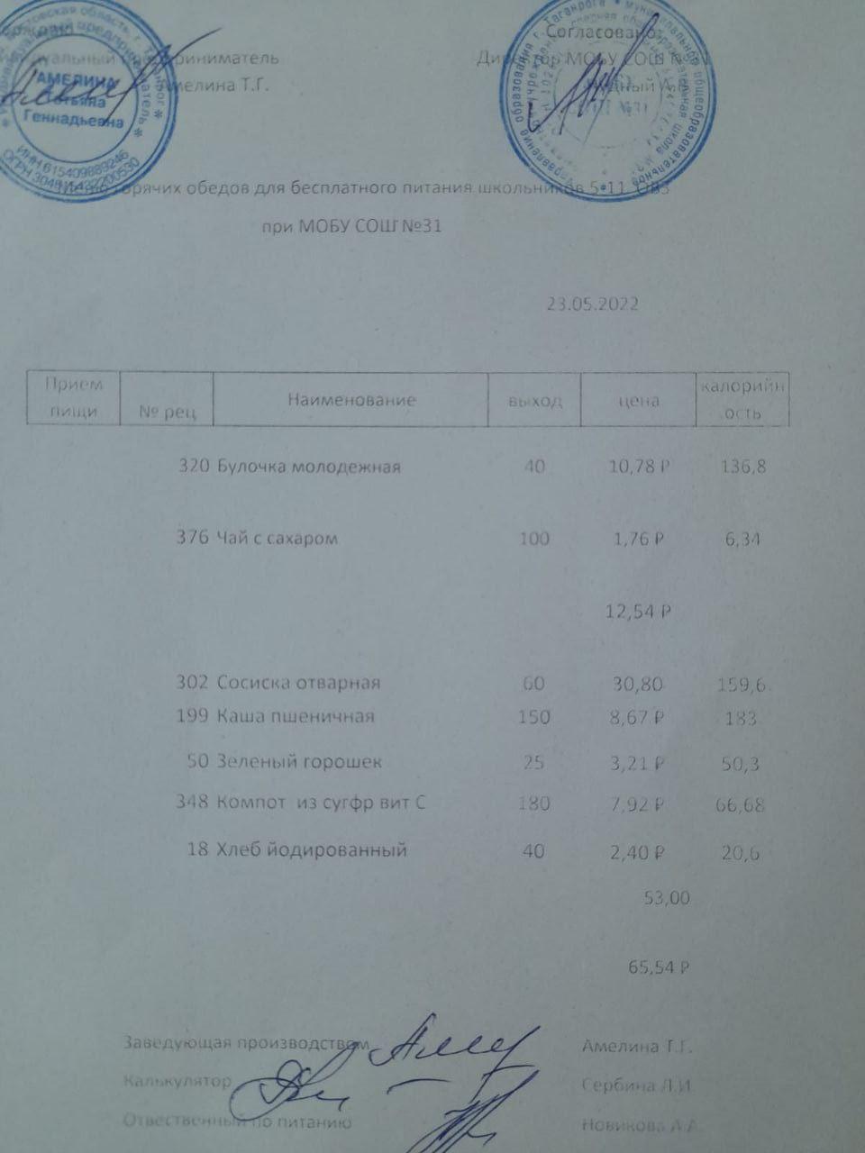 Ежедневное меню бесплатного горячего питания школьников 1-4 классов при МОБУ СОШ № 31 от 23.05.2022г.