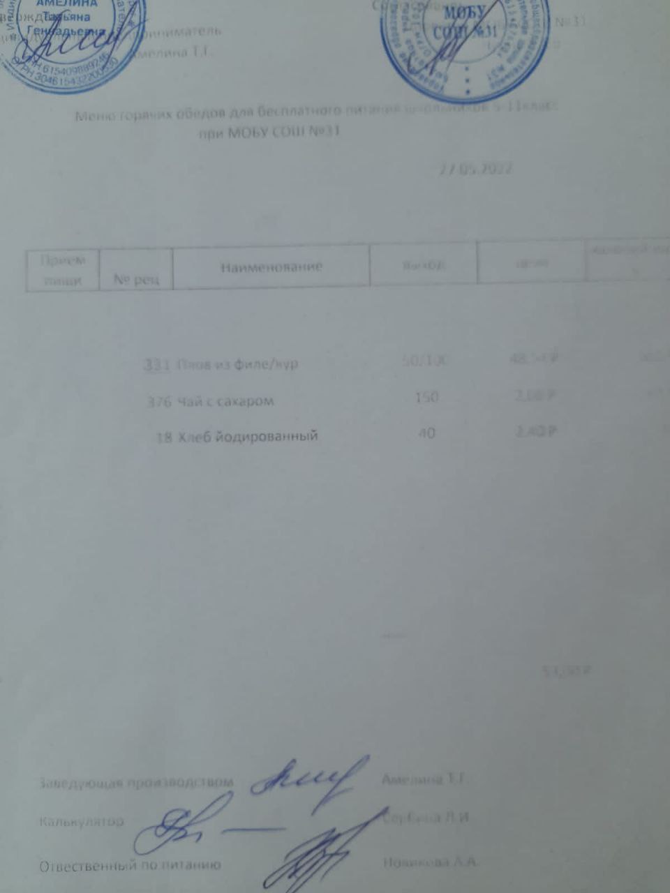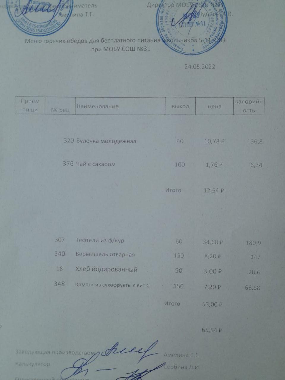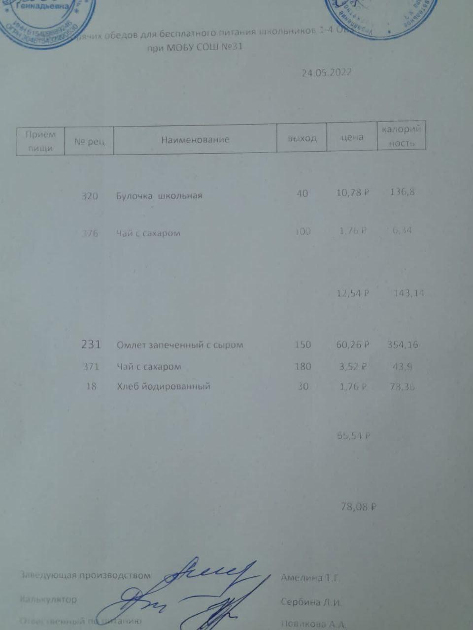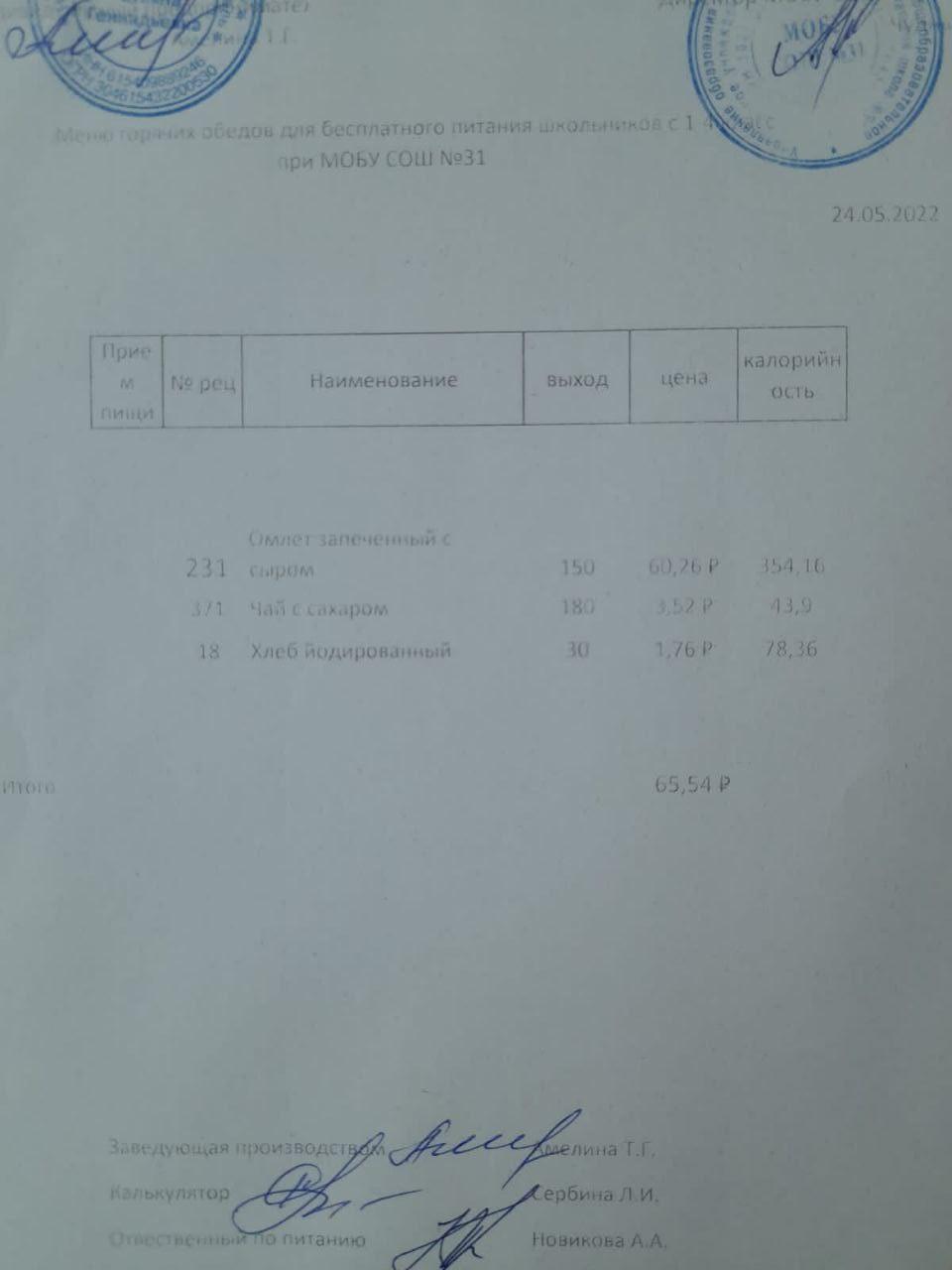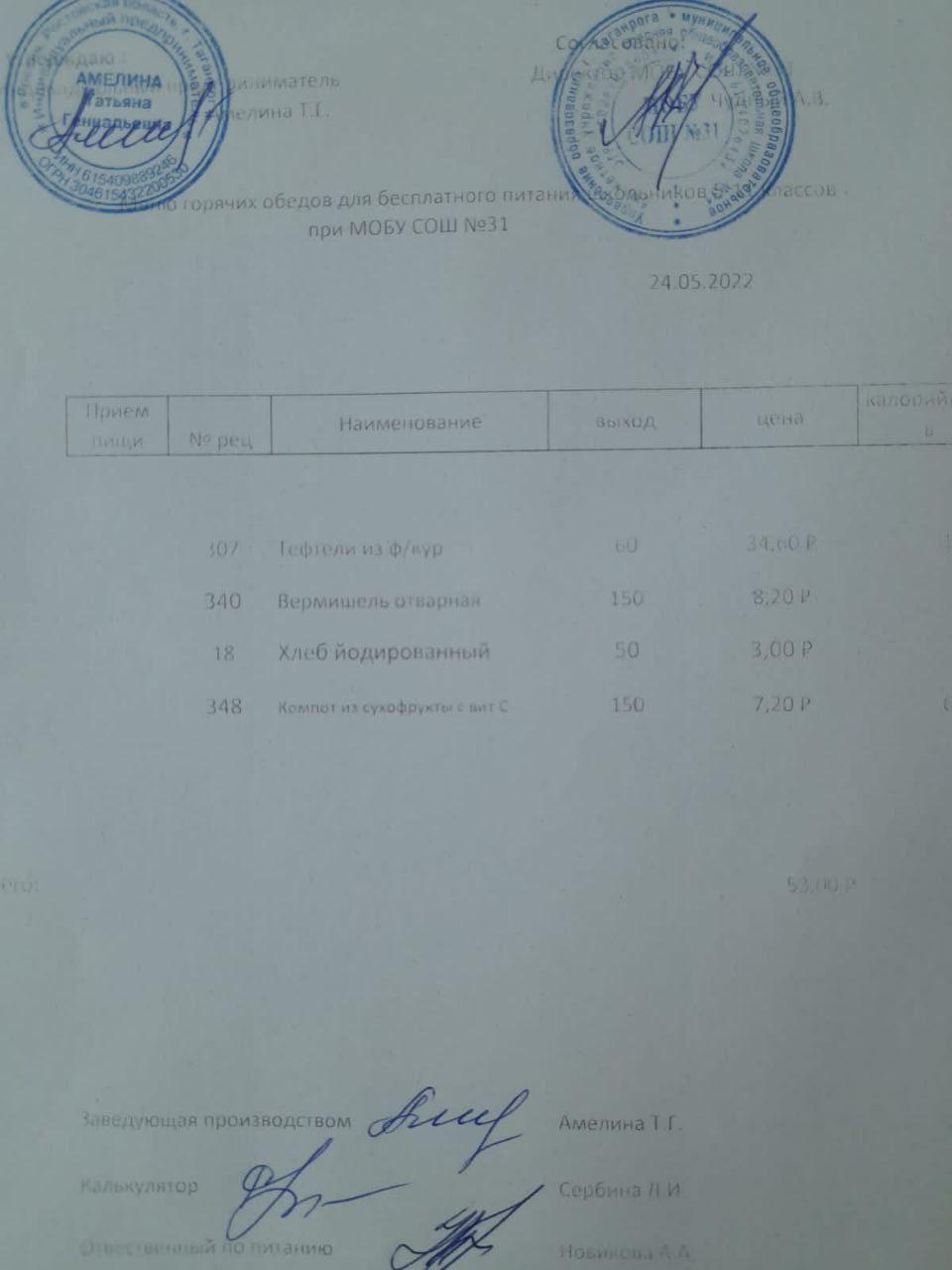 Ежедневное меню бесплатного горячего питания школьников 1-4 классов при МОБУ СОШ № 31 от 24.05.2022г.
