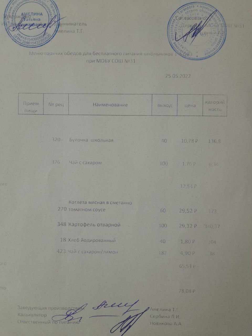 Ежедневное меню бесплатного горячего питания школьников 5 - 11 классов при МОБУ СОШ № 31 от 25.05.2022г..
