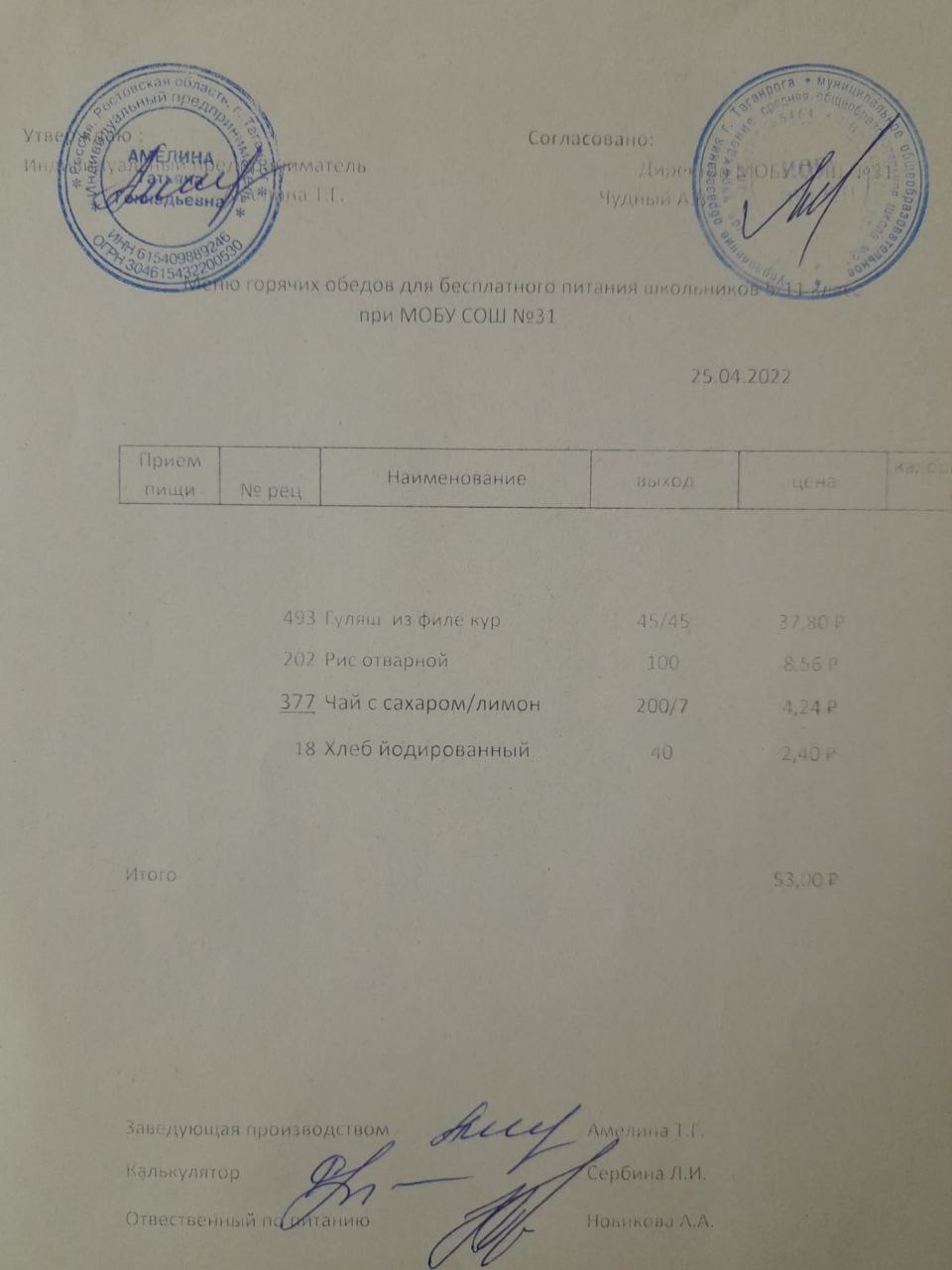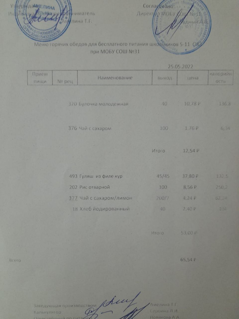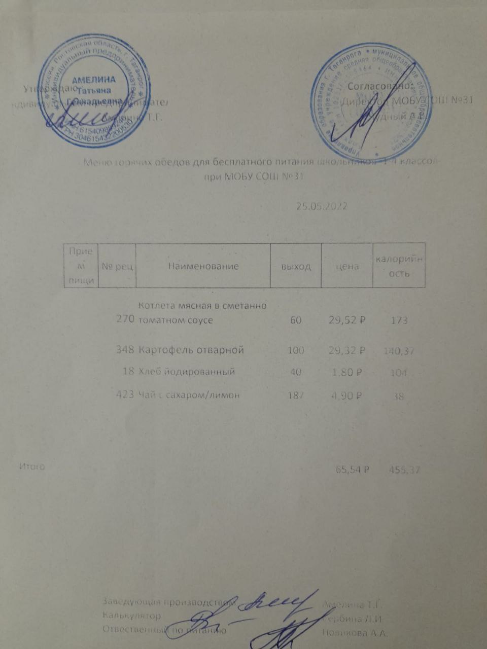 Ежедневное меню бесплатного горячего питания школьников 1-4 классов при МОБУ СОШ № 31 от 25.05.2022г.