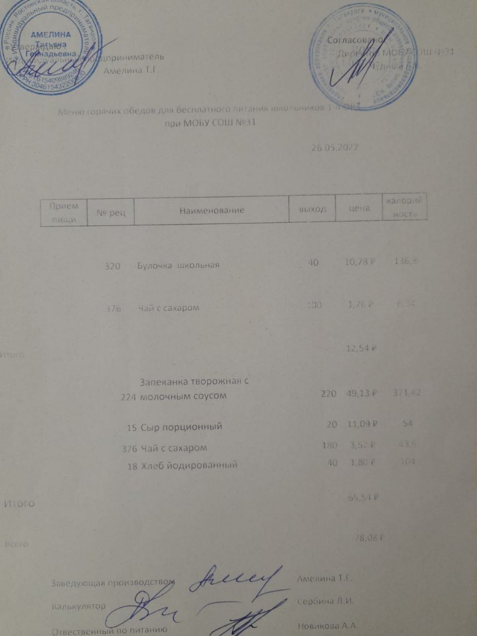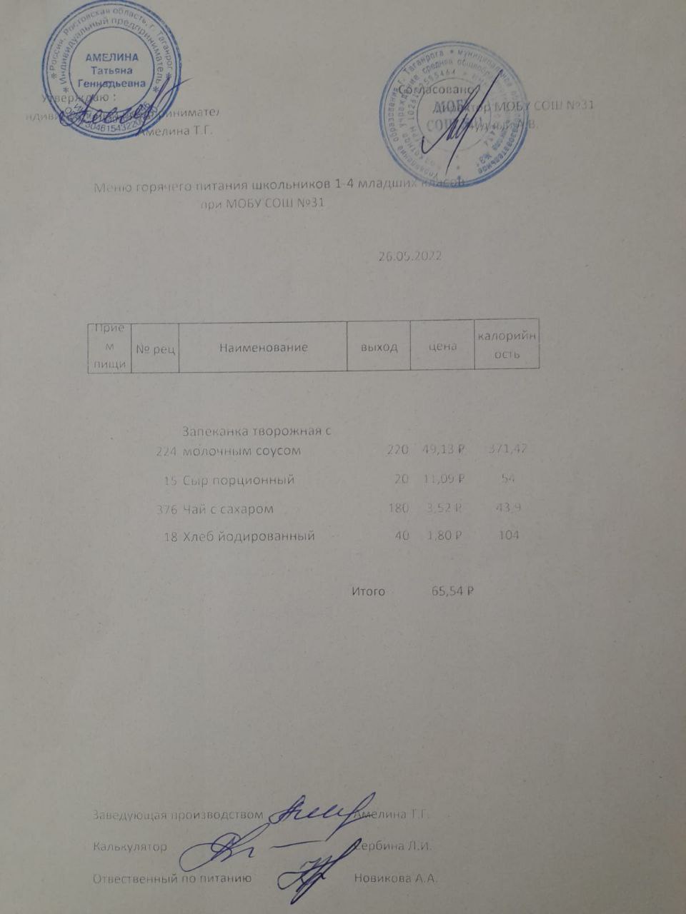 Ежедневное меню бесплатного горячего питания школьников 1-4 классов при МОБУ СОШ № 31 от 26.05.2022г.