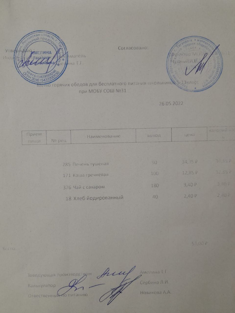 Ежедневное меню бесплатного горячего питания школьников 5 - 11 классов при МОБУ СОШ № 31 от 26.05.2022г..