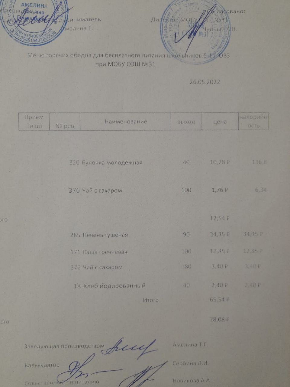 Ежедневное меню бесплатного горячего питания школьников 5 - 11 классов с ОВЗ при МОБУ СОШ № 31 от 26.05.2022г.