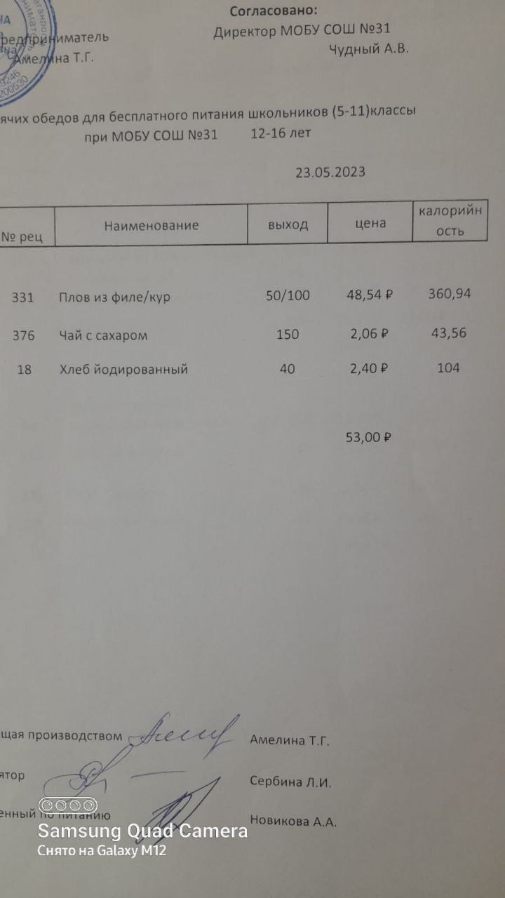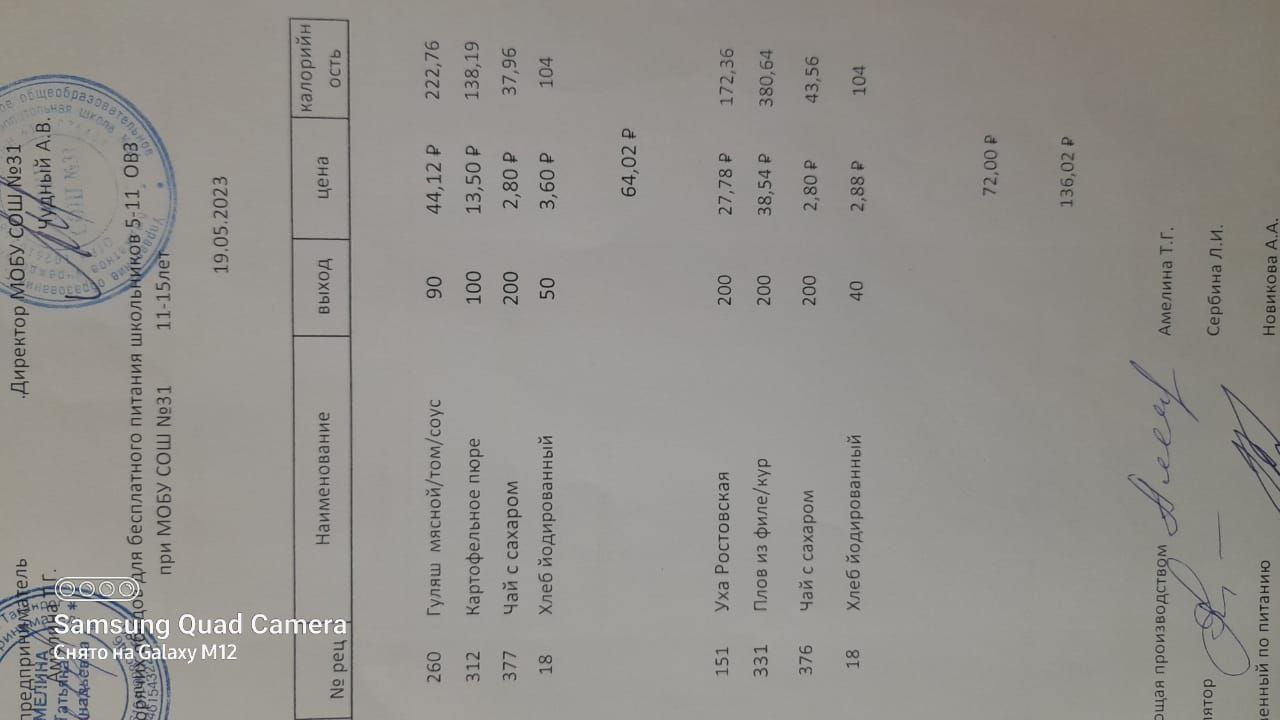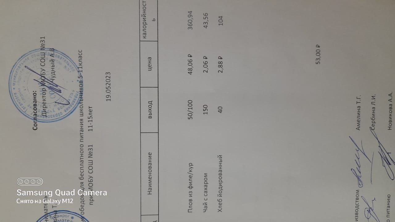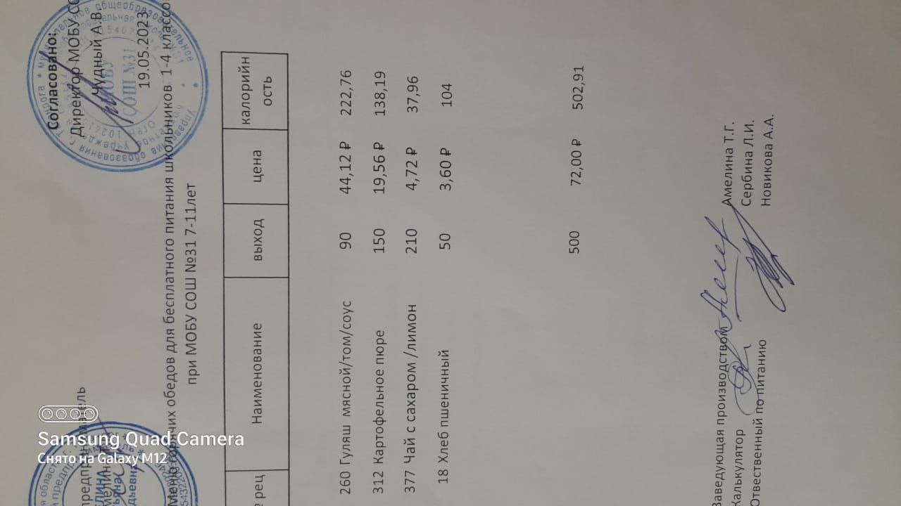 Ежедневное меню бесплатного горячего питания школьников 1-4 классов при МОБУ СОШ № 31 от 23.05.2023г.