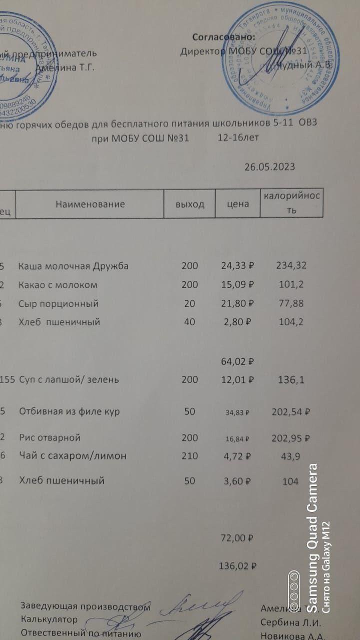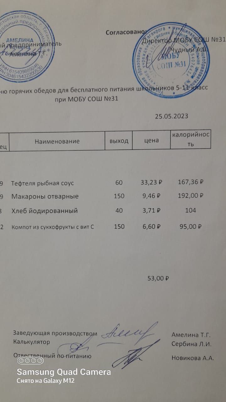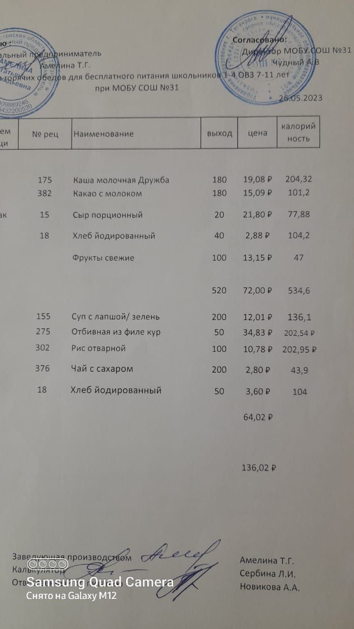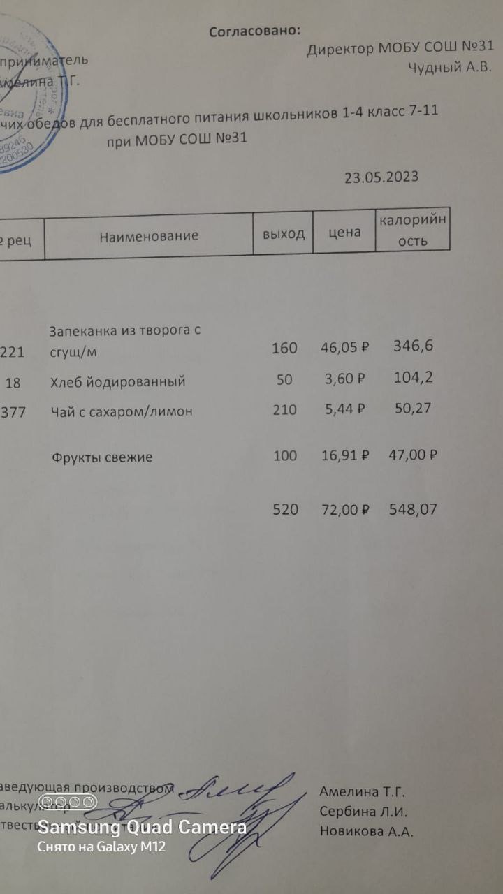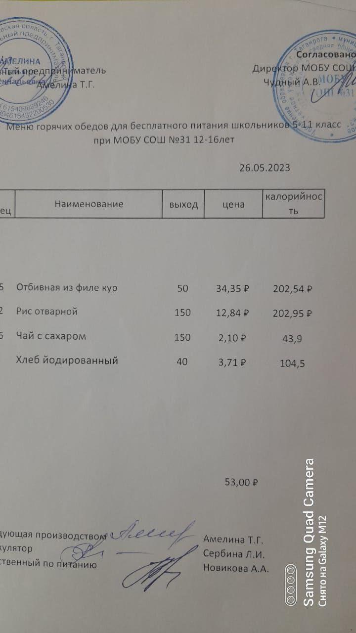 Ежедневное меню бесплатного горячего питания школьников 1-4 классов при МОБУ СОШ № 31 от 23.05.2023г.