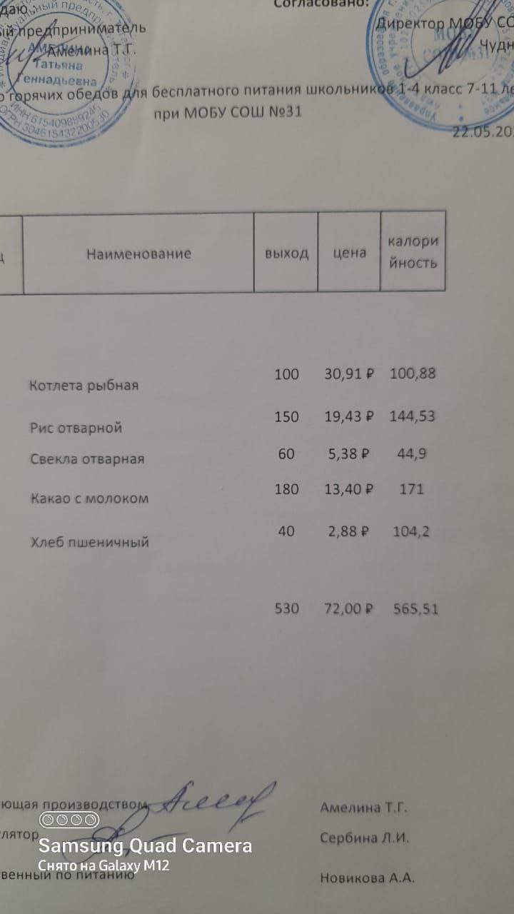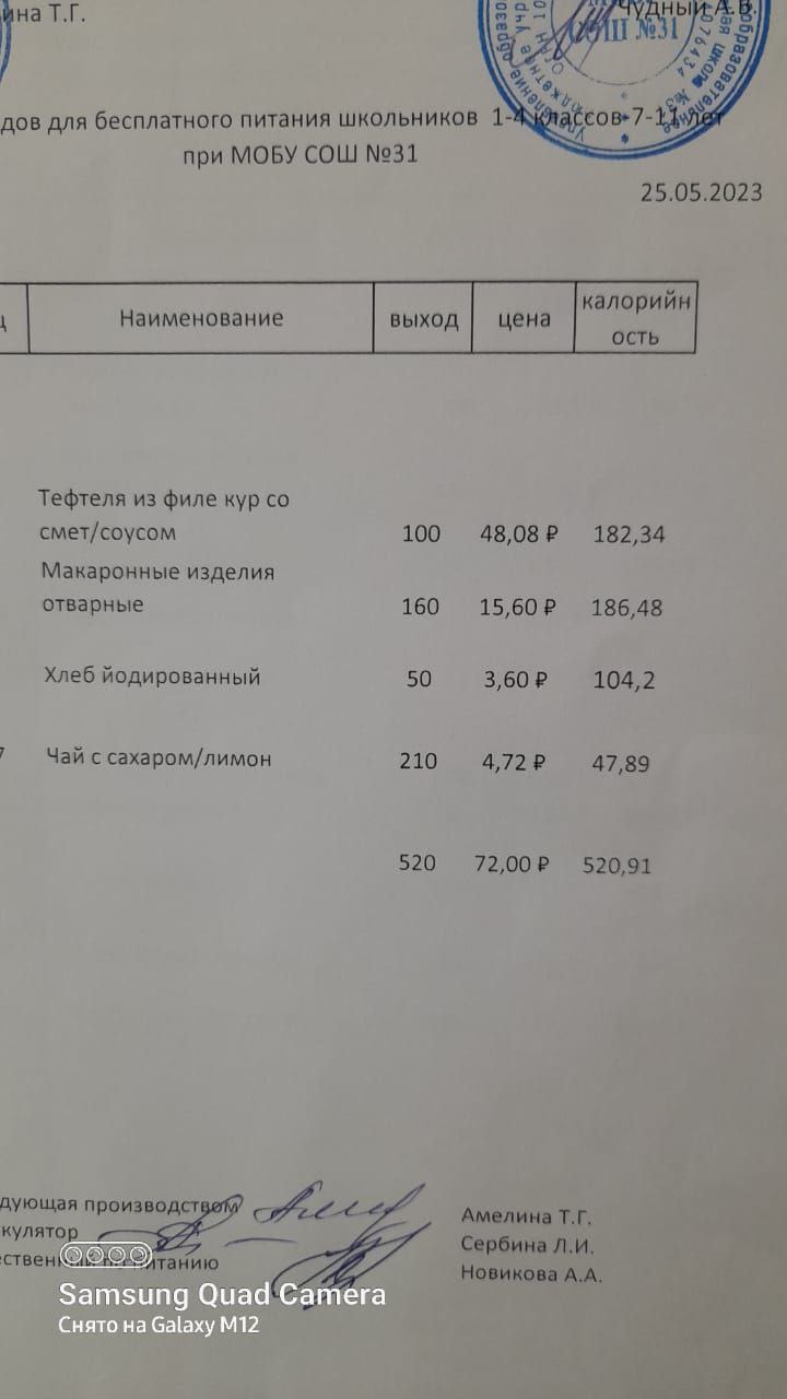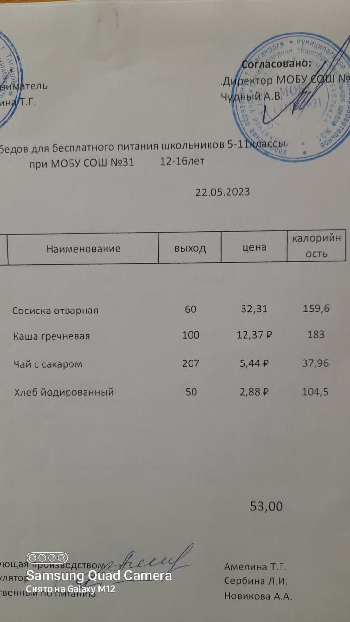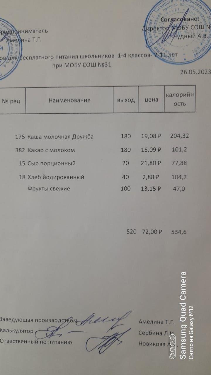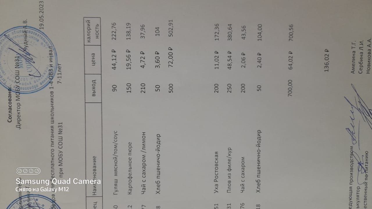Ежедневное меню бесплатного горячего питания школьников 1-4 классов при МОБУ СОШ № 31 от 22.05.2023г.