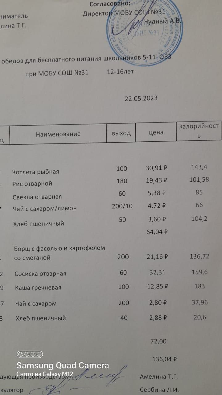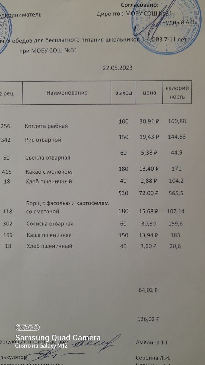 Ежедневное меню бесплатного горячего питания школьников 1 - 4 классов с ОВЗ при МОБУ СОШ № 31 от 22.05.2023г..
