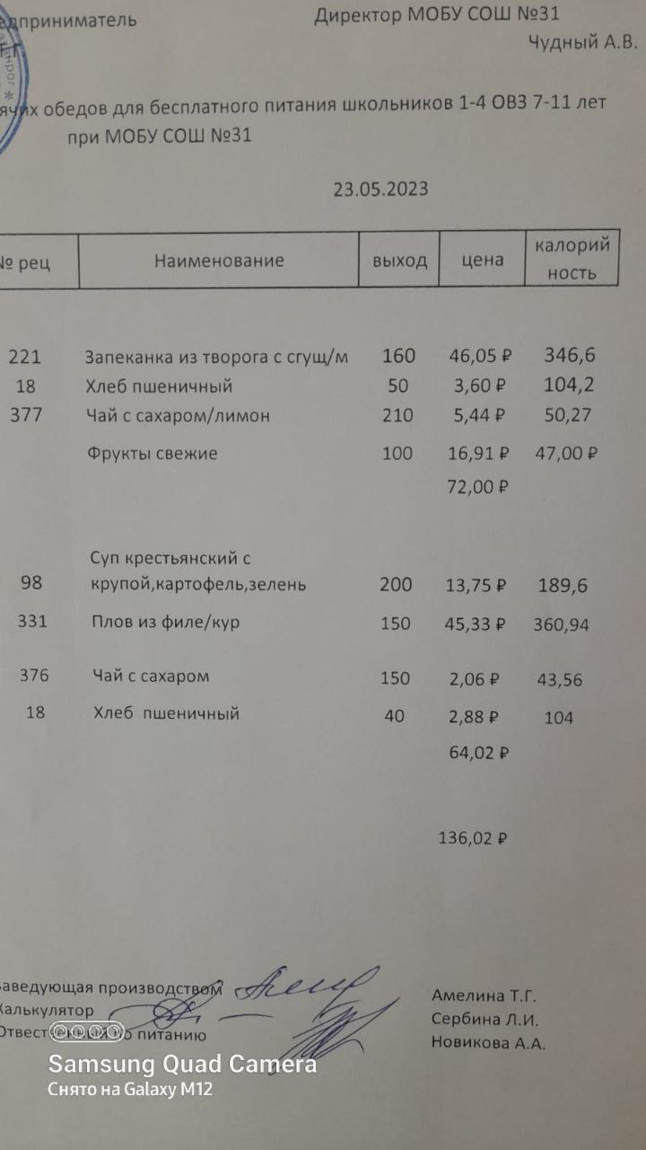 Ежедневное меню бесплатного горячего питания школьников 1 - 4 классов с ОВЗ при МОБУ СОШ № 31 от 23.05.2023г..