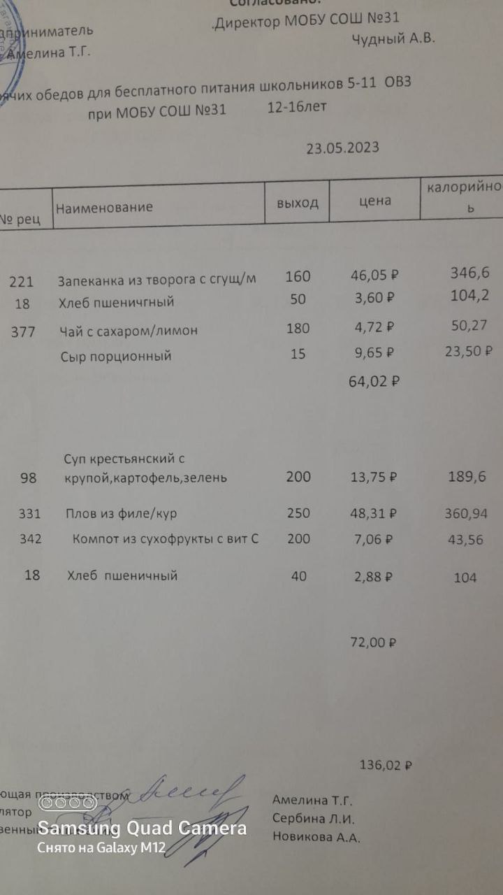 Ежедневное меню бесплатного горячего питания школьников 5 - 11 классов с ОВЗ при МОБУ СОШ № 31 от 23.05.2023г.