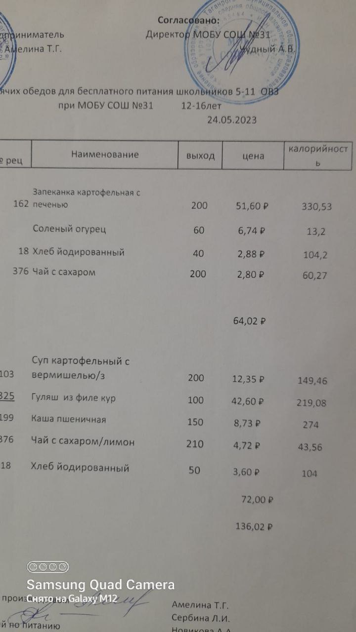 Ежедневное меню бесплатного горячего питания школьников 5 - 11 классов с ОВЗ при МОБУ СОШ № 31 от 24.05.2023г.
