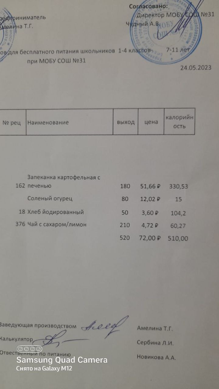 Ежедневное меню бесплатного горячего питания школьников 1-4 классов при МОБУ СОШ № 31 от 24.05.2023г.