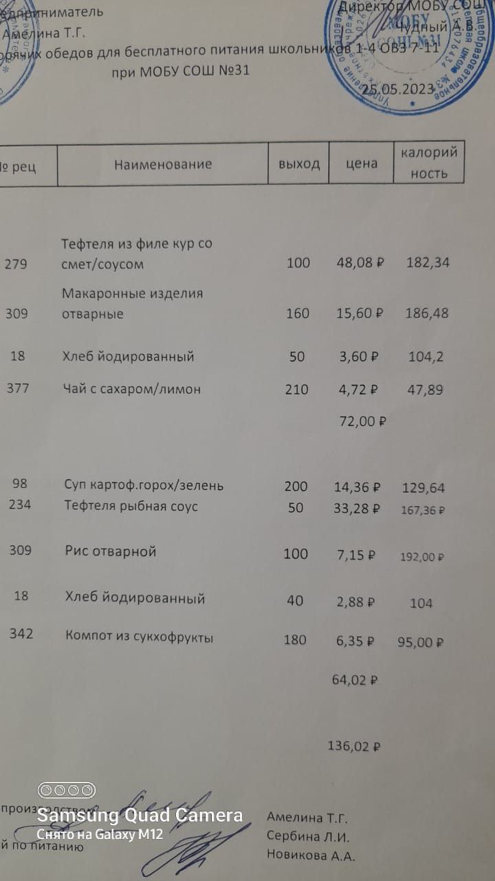 Ежедневное меню бесплатного горячего питания школьников 1 - 4 классов с ОВЗ при МОБУ СОШ № 31 от 25.05.2023г..