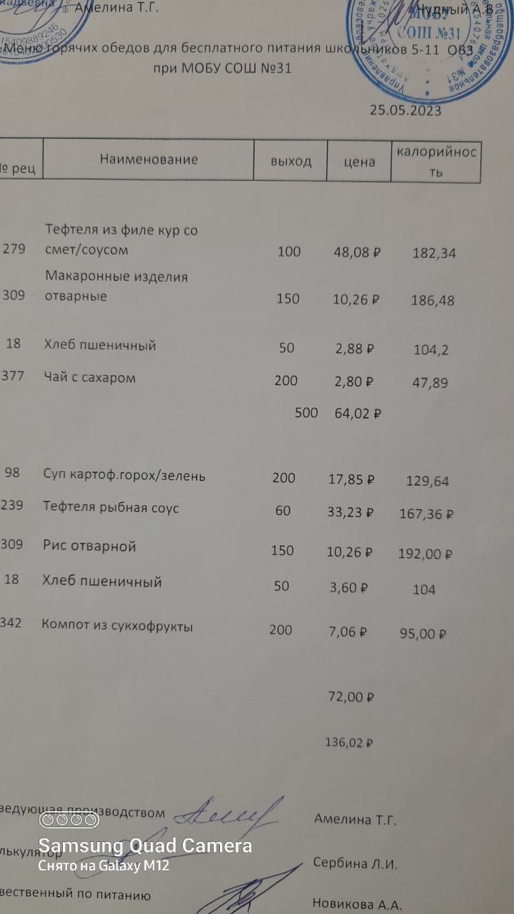 Ежедневное меню бесплатного горячего питания школьников 5 - 11 классов с ОВЗ при МОБУ СОШ № 31 от 25.05.2023г.