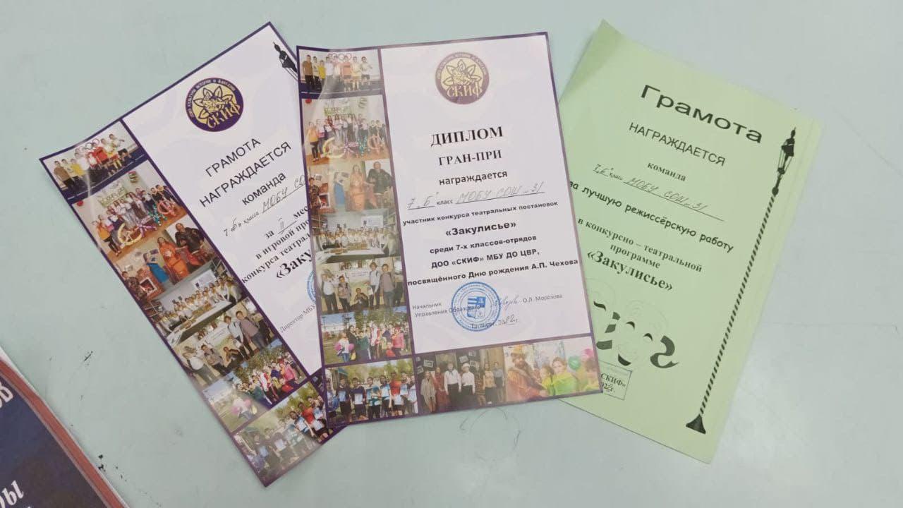 7 Б класс МОБУ СОШ 31 принял участие в театральном конкурсе среди 7х классов г. Таганрога "Закулисье", посвященном 162-летию со Дня рождения А. П. Чехова. По результатам конкурса театральная постановка нашего класса по рассказу А. П. Чехова "Ах, Зубы" была признана лучшей. 7 б класс (классный руководитель А.С. Мороз)получил наивысшую награду-Гран-при.Отдельеые артисты, Головенко Милаш, Колбешкина Елена, Псеха Елизавета были выделены за лучшее актёрское мастерство, Украйченко Софья получила диплом за лучшую афишу.