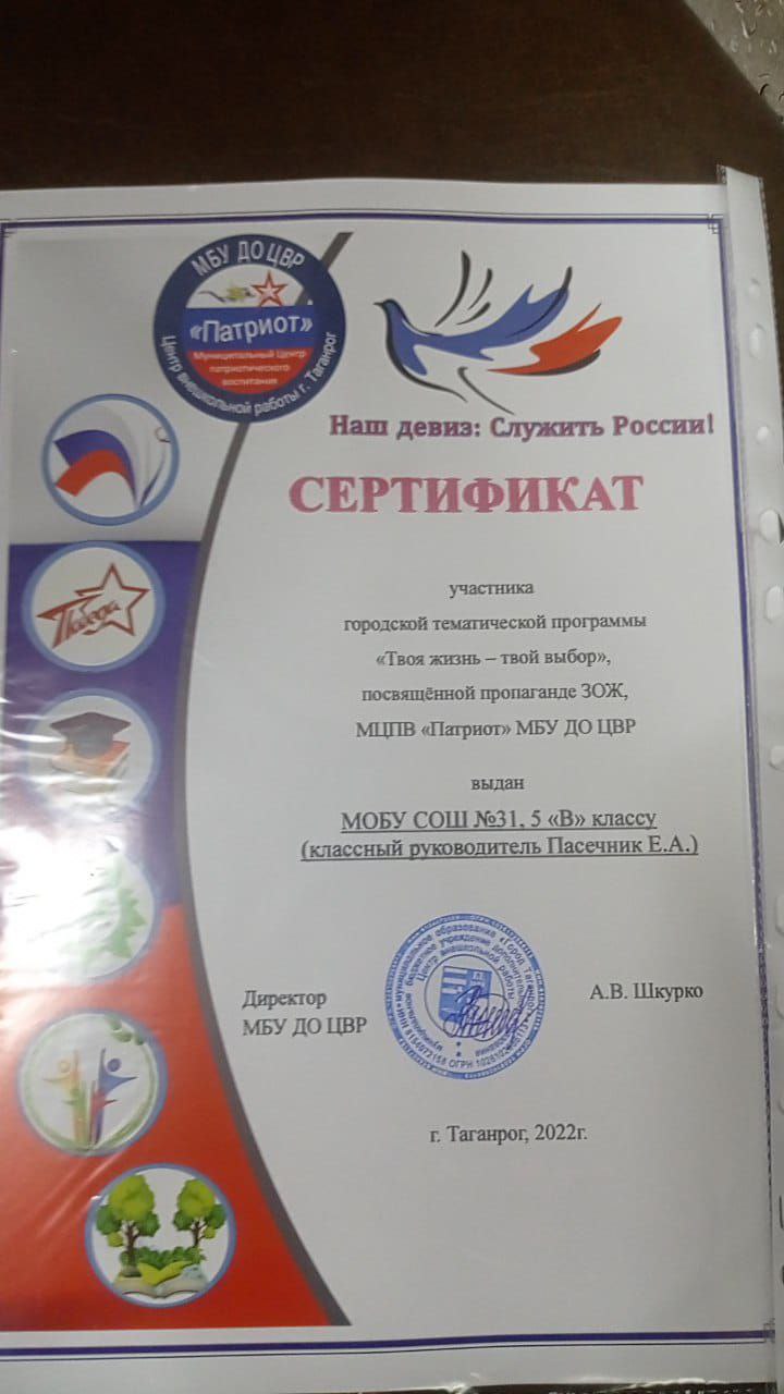 28.11 5-в класс отряд МЦПВ "Патриот" (кл руководитель Пасечник Е. А.) принял участие в городской тематической программе"Твоя жизнь-твой выбор", посвящённой пропаганде ЗОЖ.