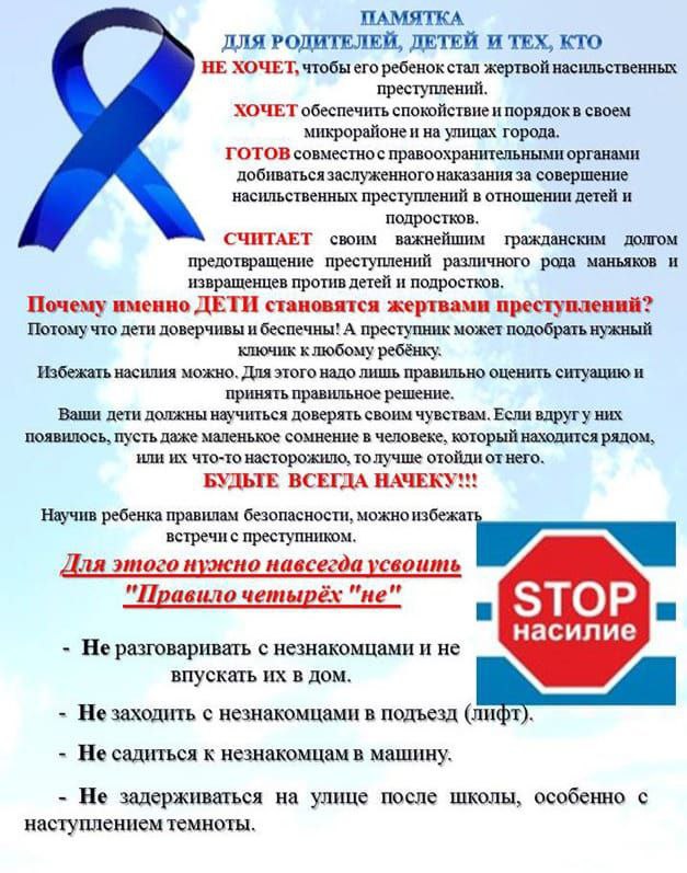 В последнее время достаточно часто мы слышим фразу "Синяя лента апреля". Акция " Синяя лента апреля" - это способ профилактики жестокого обращения и насилия над детьми. Начало этой традиции положила история, произошедшая весной 1989 года. Жительница Норфолка (США) Бонни Финей узнала о гибели своего четырёхлетнего внука Майкла. Сначала мальчик оказался в больнице с травмами, затем его пытались вернуть родной матери, но ребёнок плакал, кричал, что мама его не любит, и не хотел возвращаться. Бабушка по состоянию здоровья не могла заботиться о внуке и взять его к себе. Суд решил, что лучшим местом для ребёнка будет его родной дом. С того момента Бонни Финей своего внука больше не видела. Вскоре её младшая внучка также попала в больницу с переломом ноги в четырёх местах, а на руках девочки были следы ожогов от сигарет. Только после этого начались поиски пропавшего Майкла. Оказалось, что мальчик был убит другом матери, помещён в ящик от инструментов, а затем утоплен в болоте. Случившееся настолько потрясло Бонни, что она решила посвятить свою жизнь борьбе с насилием над детьми. Во время похорон внука она привязала синюю ленту к антенне своего фургона. Почему синюю? Женщина объясняет это тем, что не может забыть синяки на теле своих внуков. Синий цвет служит постоянным напоминанием о том, что необходимо бороться с насилием и защищать детей от жестокого обращения. Вскоре к Бонни присоединилось множество людей, различных агентств и общественных объединений, которые также считают насилие над детьми недопустимым. Классные руководители провели классные часы и рассказали обучающимся о детском телефоне доверия, службах помощи в городе Таганроге. Учащиеся начальной школы раскрасили "заботливые ручки", которые должны быть в каждой семье. Также родителям по мессенджеру ватцап были разосланы памятки.