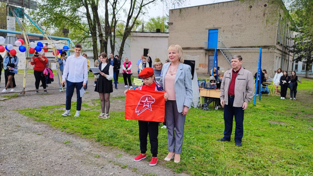 Куратор юнармейского движения города Таганрога Жанна Александровна вручила знамя Юнармии командиру отряда 1 "В" класса "Бастион".