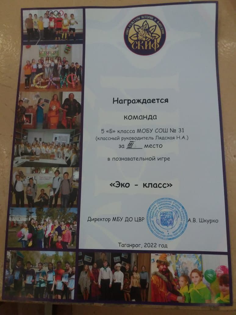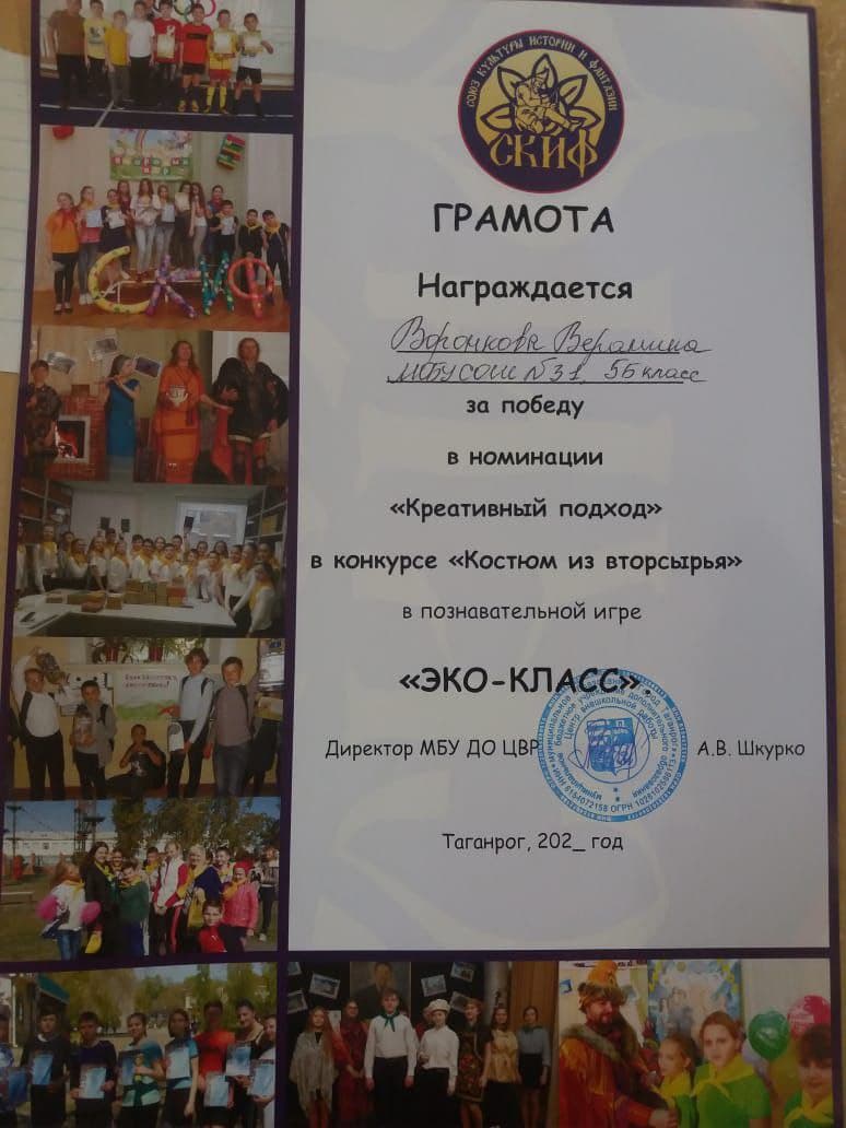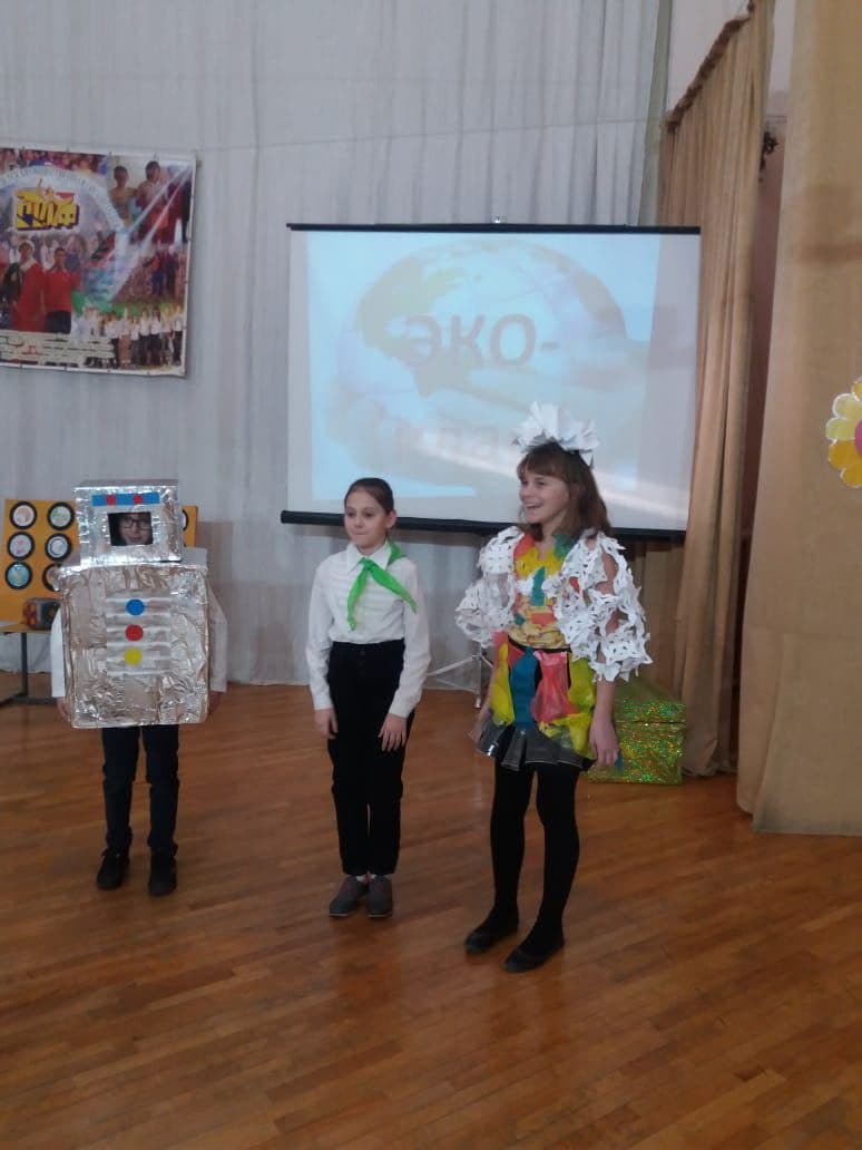 Команда 5б класса Экстрим заняла 3 место в познавательной игре "Эко класс". Ворокова Вероника и Васютченко Богдан заняли 1 место в конкурсе "Костюм из вторсырья". (МБУ ДО ЦВР))