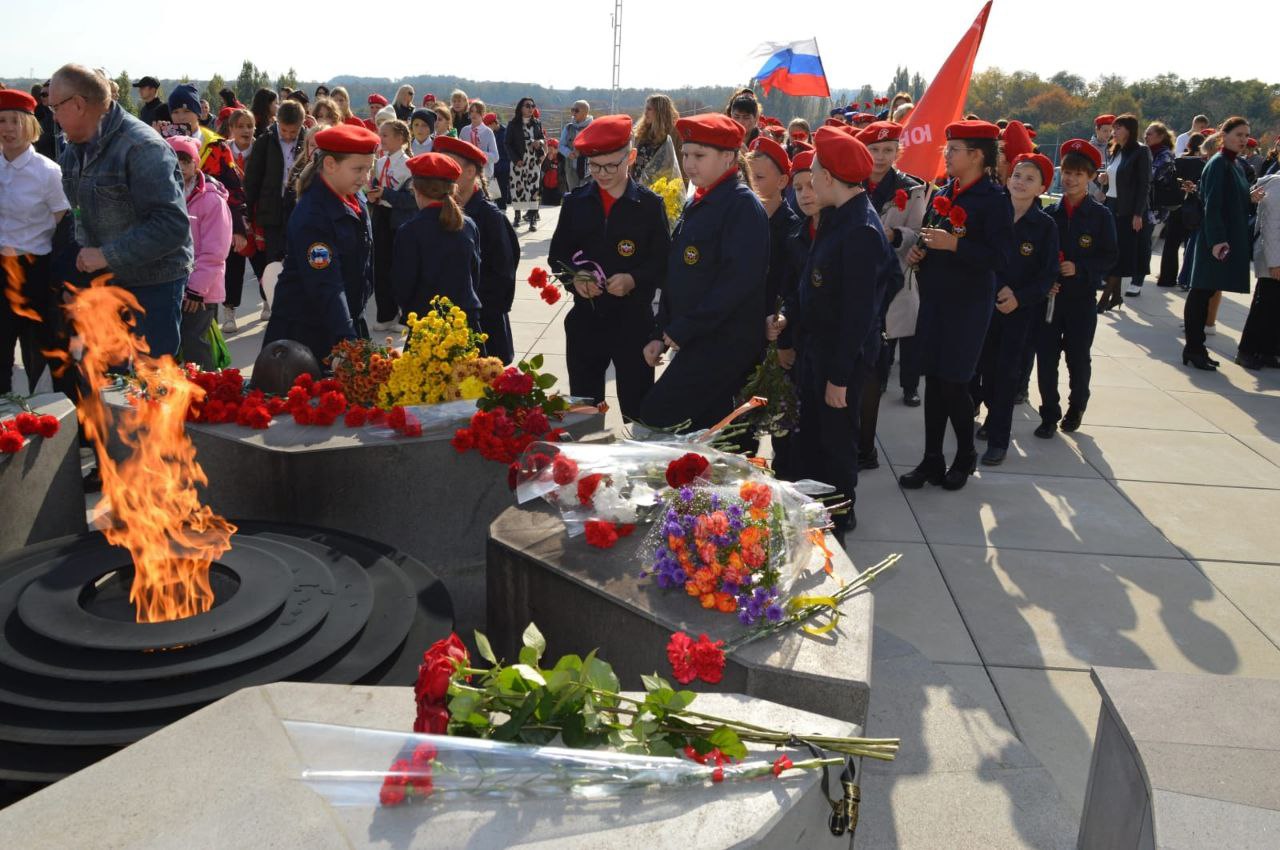 Перед началом торжественного посвящения в юнармейцы, ребята и гости мероприятия возложили цветы к Вечному огню на Аллее Славы.