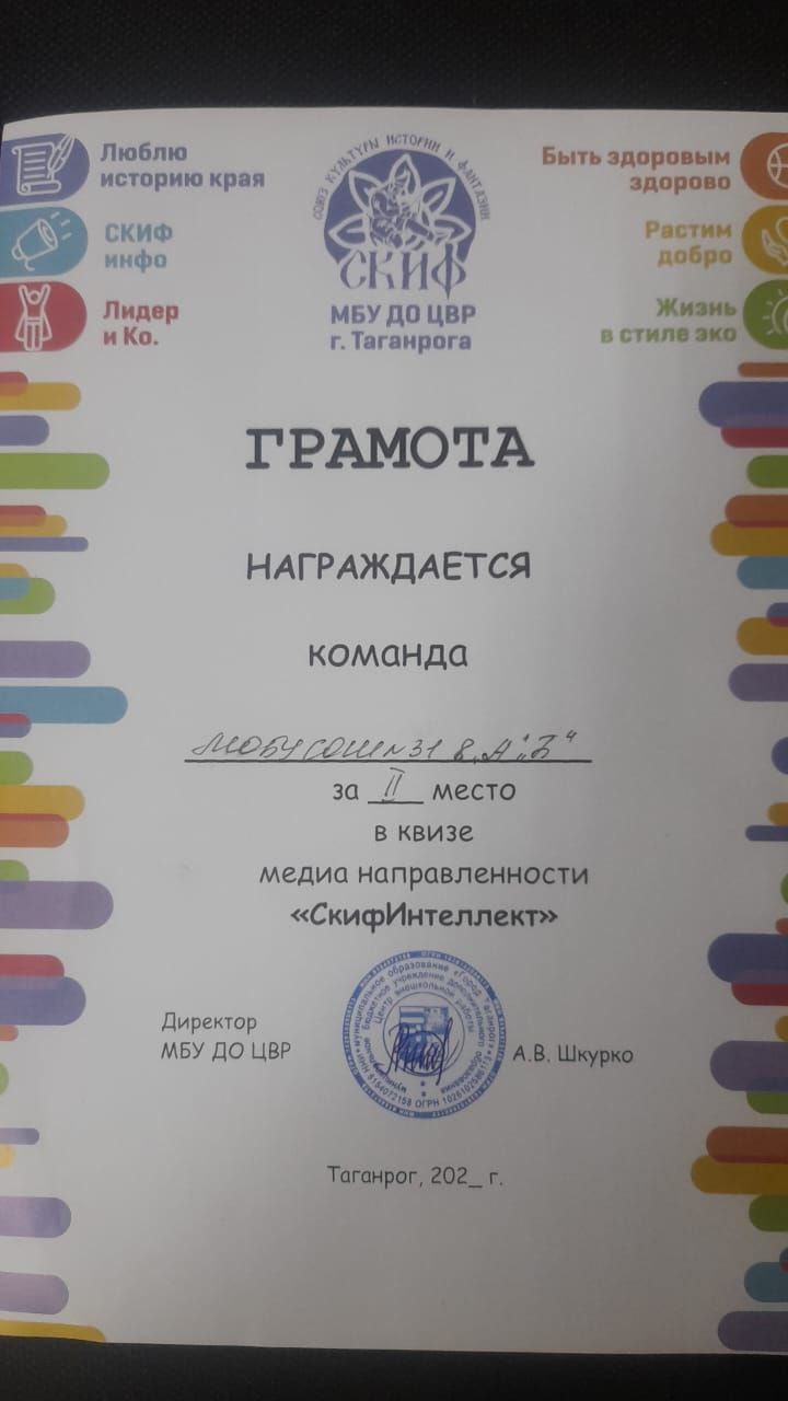 15.11.2023 г. Поздравляем команду ДОО СКИФ (обучающиеся 8 "А"класса), занявшую 2-е место в квизе "СкифИнтеллект"!