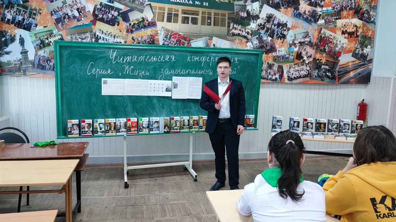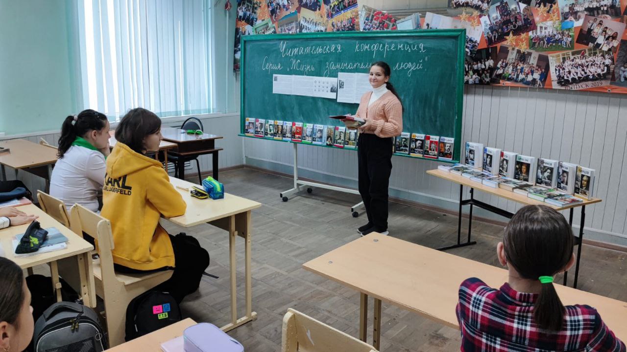 В целях привлечения обучающихся к чтению, формирования коллективного читательского мнения, воспитания умения у школьников умения глубоко анализировать прочитанное, высказывать и защищать собственное мнение, в нашей школе проведена школьная читательская конференция. В школьной библиотеке оформлена книжная выставка из книг серии Жизнь замечательных людей, издательство «Молодая гвардия»