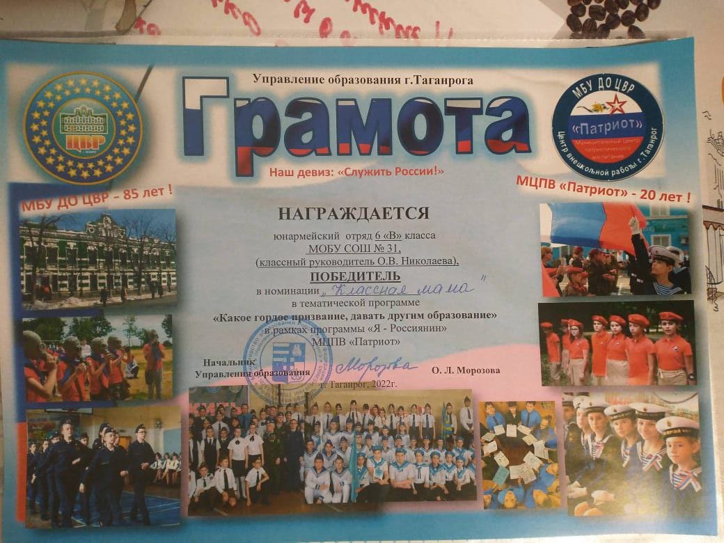 Обучающиеся 6 «В» класса (кл. руководитель Николаева О.В.) приняли участие в тематической программе МЦПВ «Патриот» «Какое гордое призвание, давать другим образование». Юнармейцы 6 «В» класса стали победителями в номинации «Классная мама».