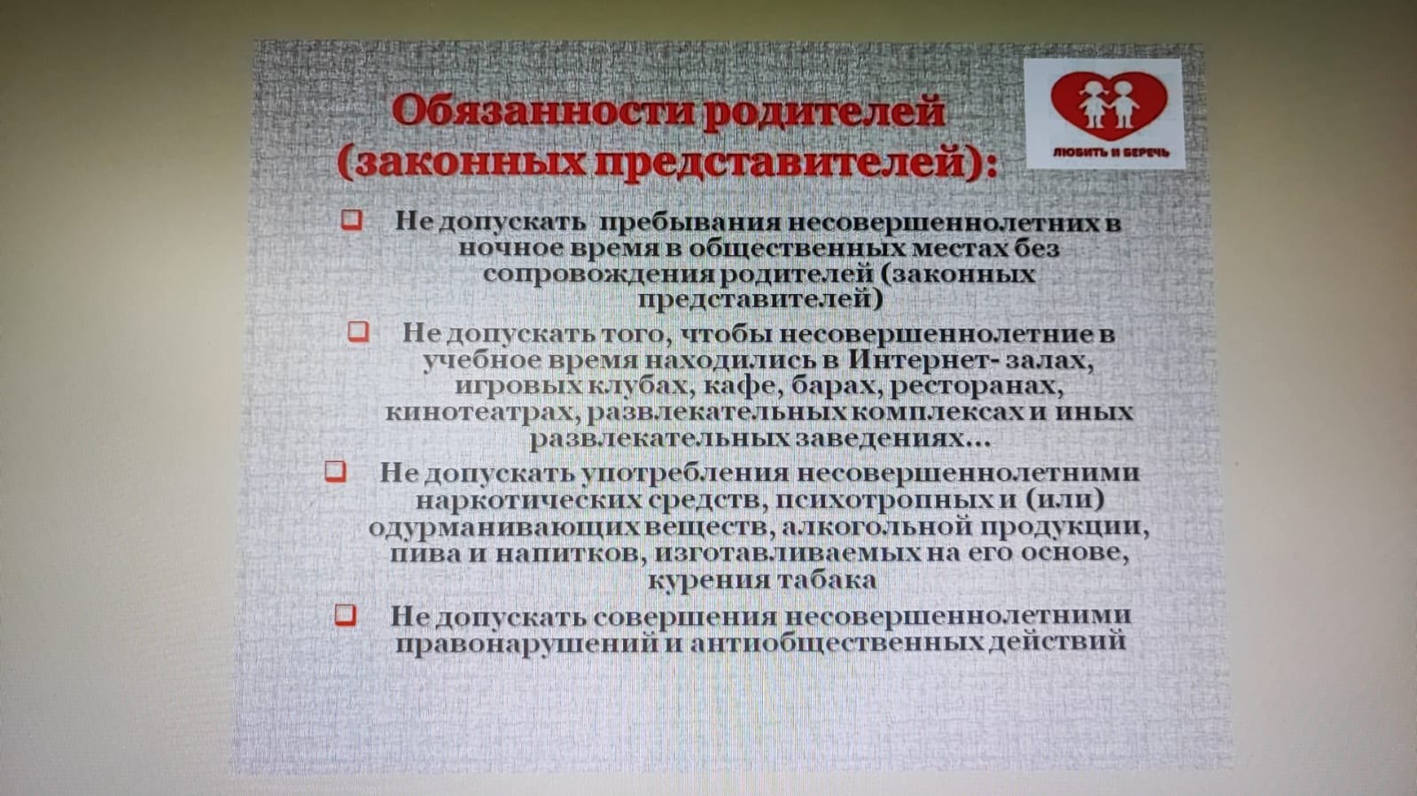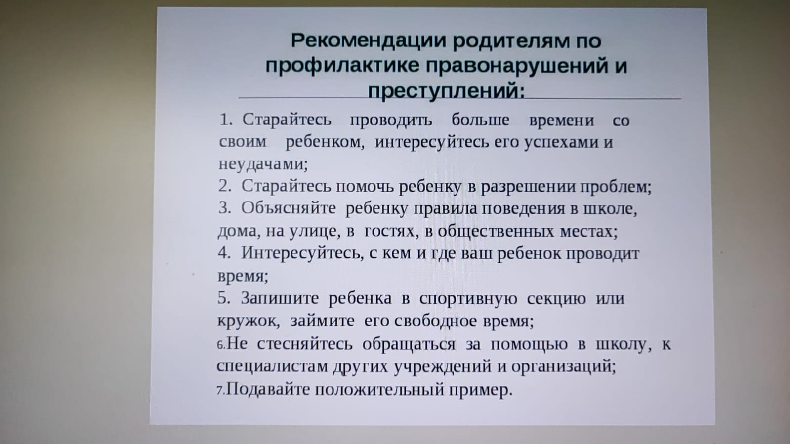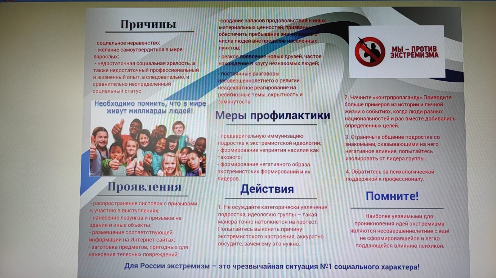 13 февраля проводится родительский школьный всеобуч на тему: "Правовая ответственность родителей (законных представителей) и детей за совершение правонарушений, в том числе экстремистской направленности". Сотрудниками УМВД России по г. Таганрогу с администрацией школы была проведена информационно-просветительская беседа. Классными руководителями были разосланы памятки и разъяснительные материалы с целью повышения правовой грамотности родителей ( законных представителей).