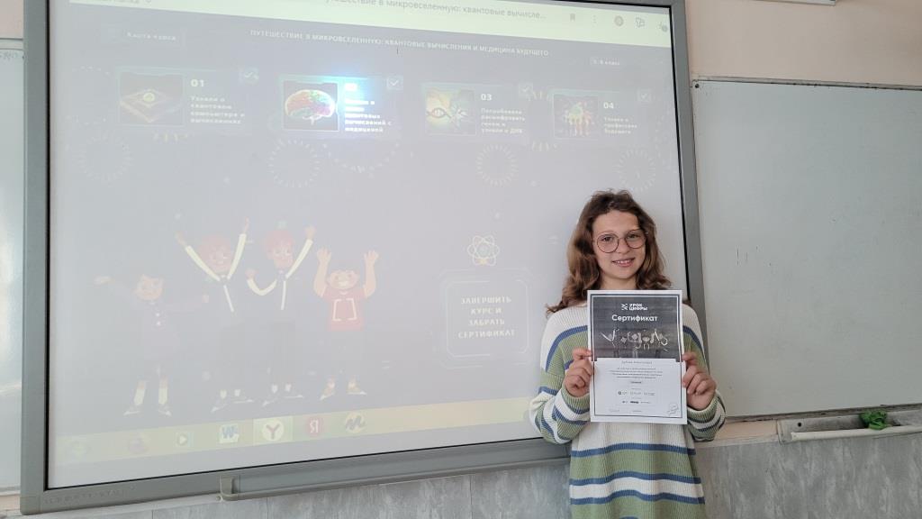С 08.04.2024 г. обучающиеся 5-11 классов приняли участие в «Уроке Цифры», проходя обучающий тренажер, учащиеся узнали о квантовых технологиях, вычислениях и областях их применения в медицине. Как работают квантовые технологии, в чём принцип квантовых вычислений, какую пользу приносят человеку и какие перспективы развития имеет квантовая физика, а также какие профессии появятся в будущем благодаря развитию квантовых технологий. За прохождение тренажеров, ребята получали именные сертификаты. Успешного дальнейшего участия ребятам в игровых тренажерах разных уровней обучения!