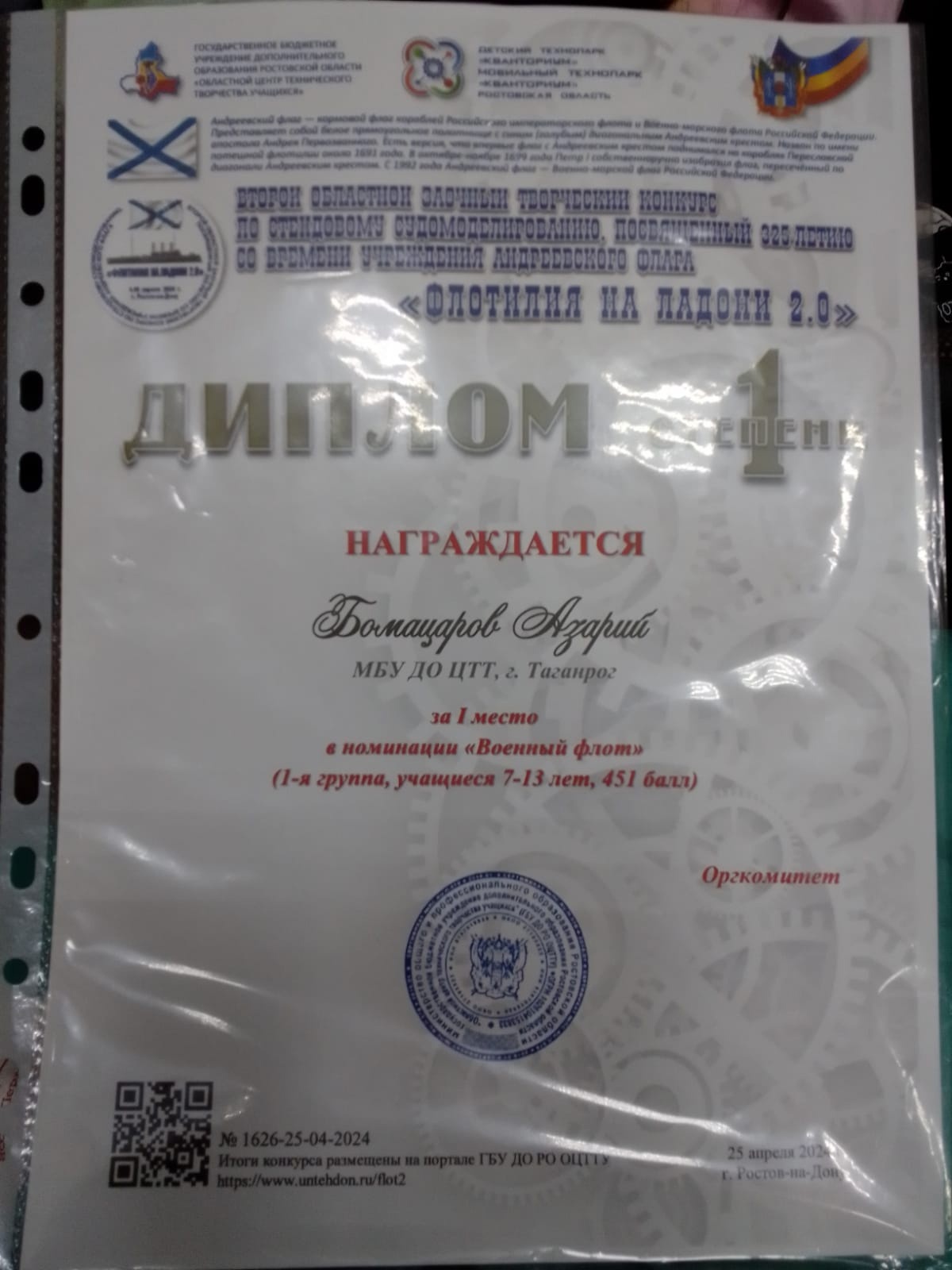 Обучающийся нашей школы Бомацаров Азарий занял первое место в областном творческом конкурсе по стендовому судомоделированию.