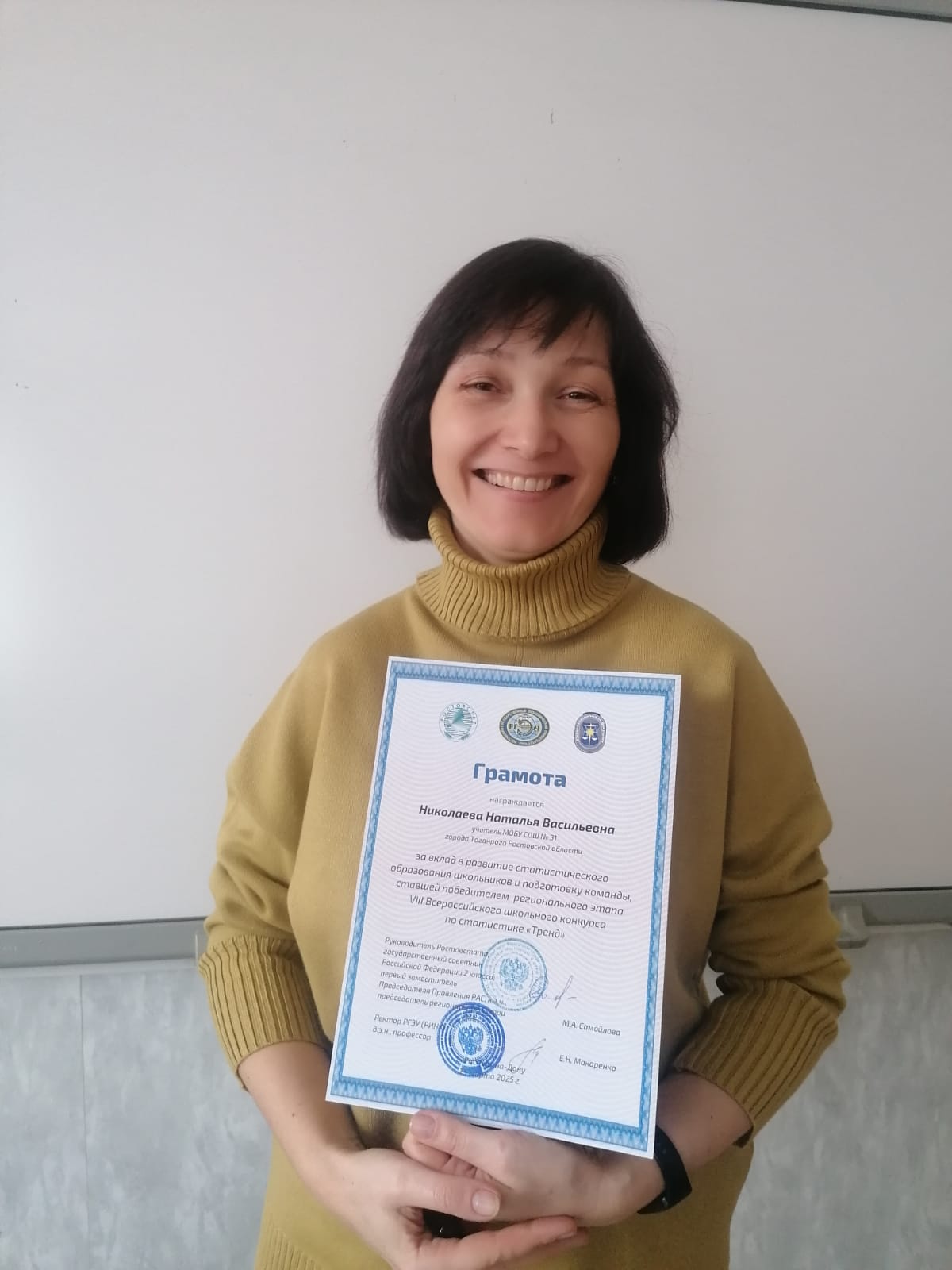 На региональный этап Всероссийского школьного конкурса по статистике «Тренд» учителем-наставником Николаевой Н.В. и обучающимися 7 б класса Истоминой Анной, Романовой Екатериной была представлена работа «Портрет посетителя Эрмитажа на основе данных веб-камер» в Номинации «Учимся собирать статистические данные», которая была признана лучшей и принесла команде победу! Церемония награждения прошла в здании Территориального органа Федеральной службы государственной статистики по Ростовской области в городе Ростове-на-Дону.