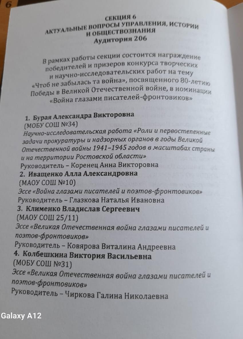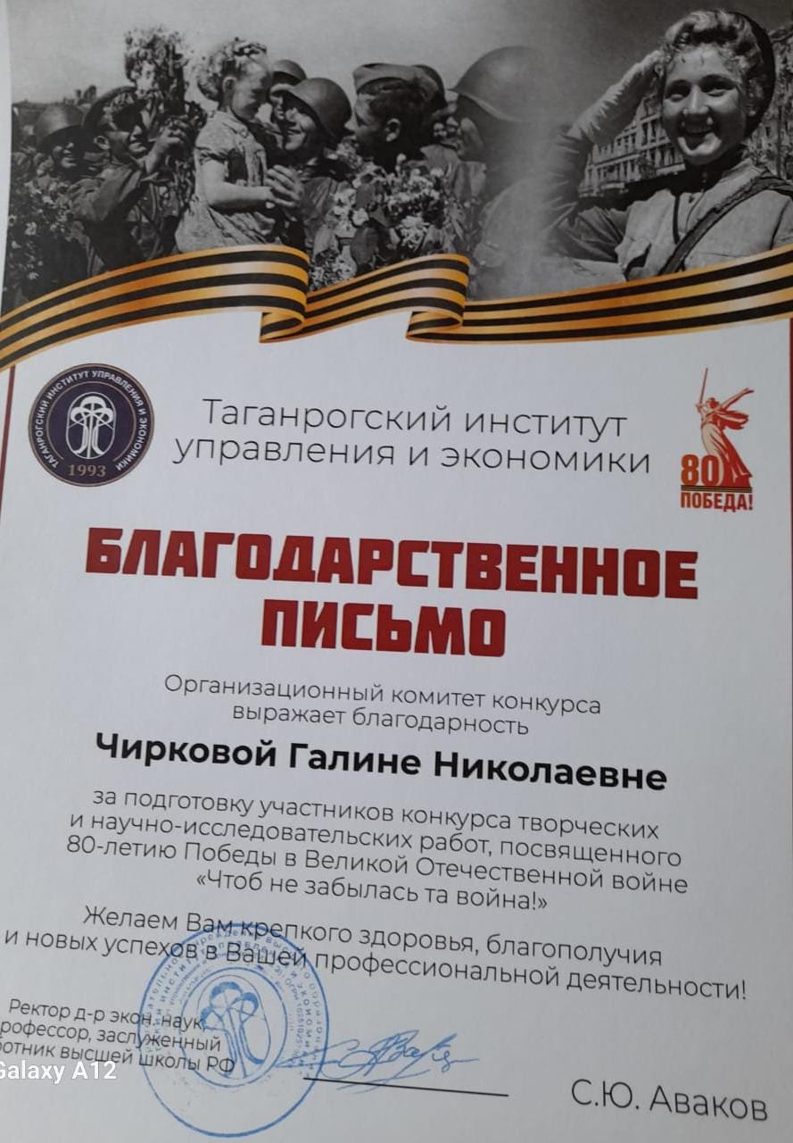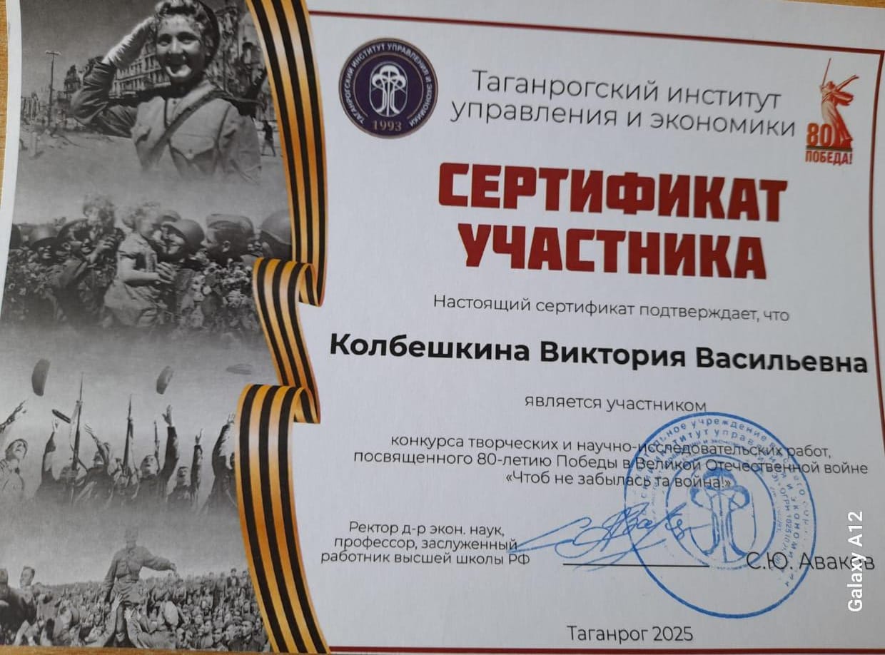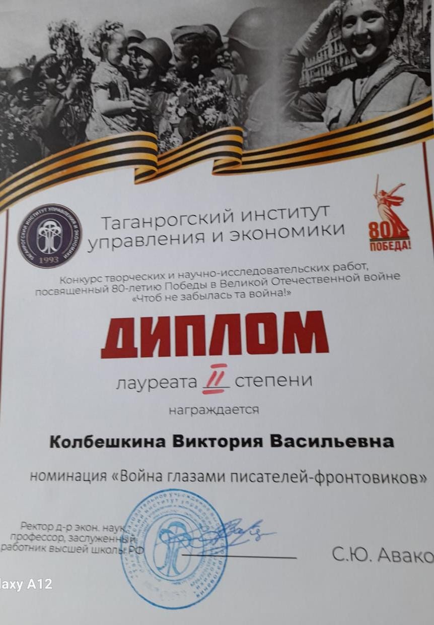 Обучающаяся 8 В класса Колбешкина Виктория, под руководством учителя русского языка и литературы Чирковой Галины Николаевны, приняла участие в конкурсе творческих и научно-исследовательских работ, посвященного 80-летию Победы в Великой Отечественной войне «Чтоб не забылась та война!» в номинации «Война глазами писателей-фронтовиков». Поздравляем дипломанта 2 степени!