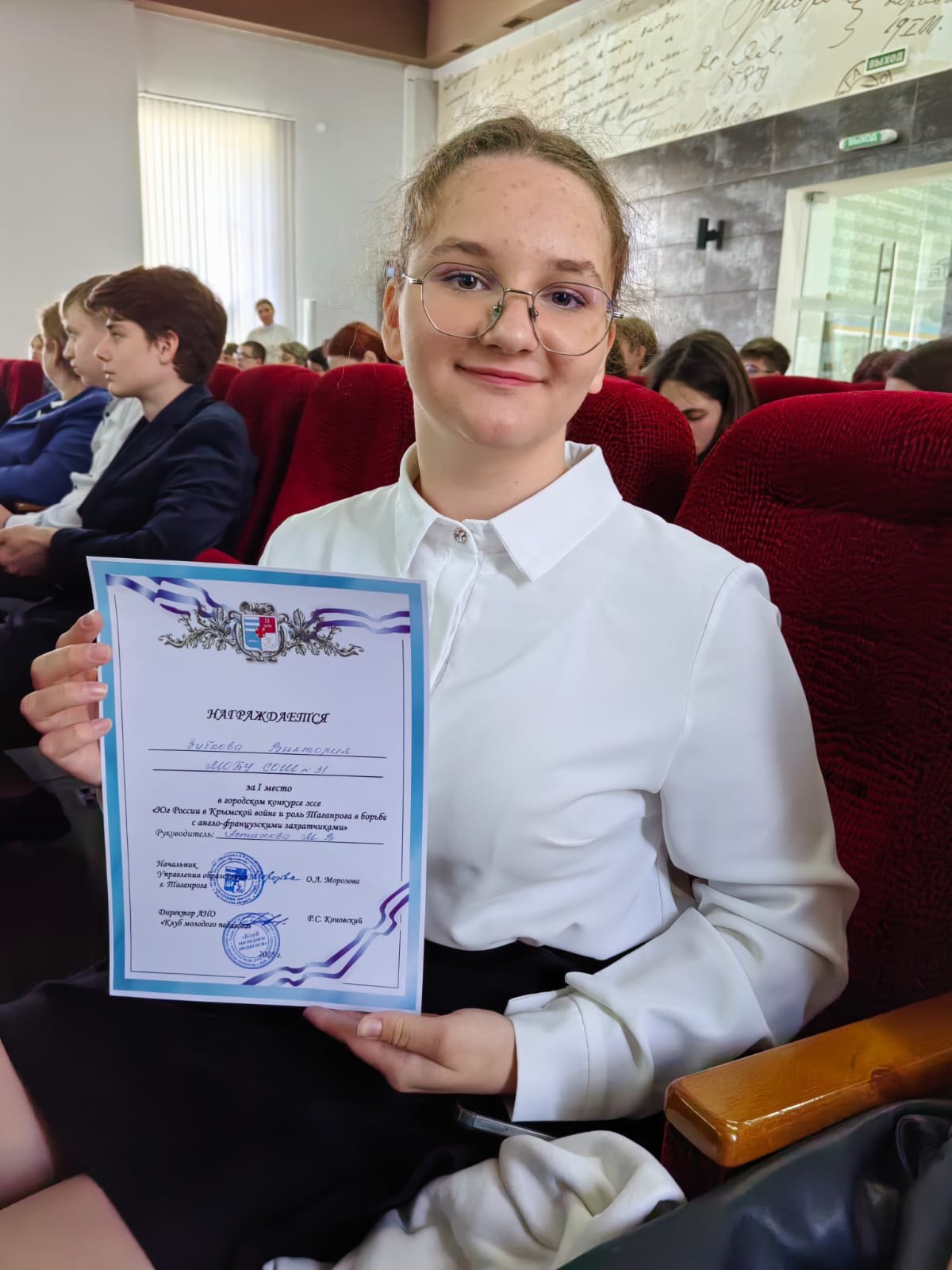 Обучающаяся 8 "А" класса Зубкова Виктория ( руководитель Астахова М. В.) победила в городском конкурсе эссе "Юг России в Крымской войне и роль Таганрога в борьбе с англо - французкими захватчиками".