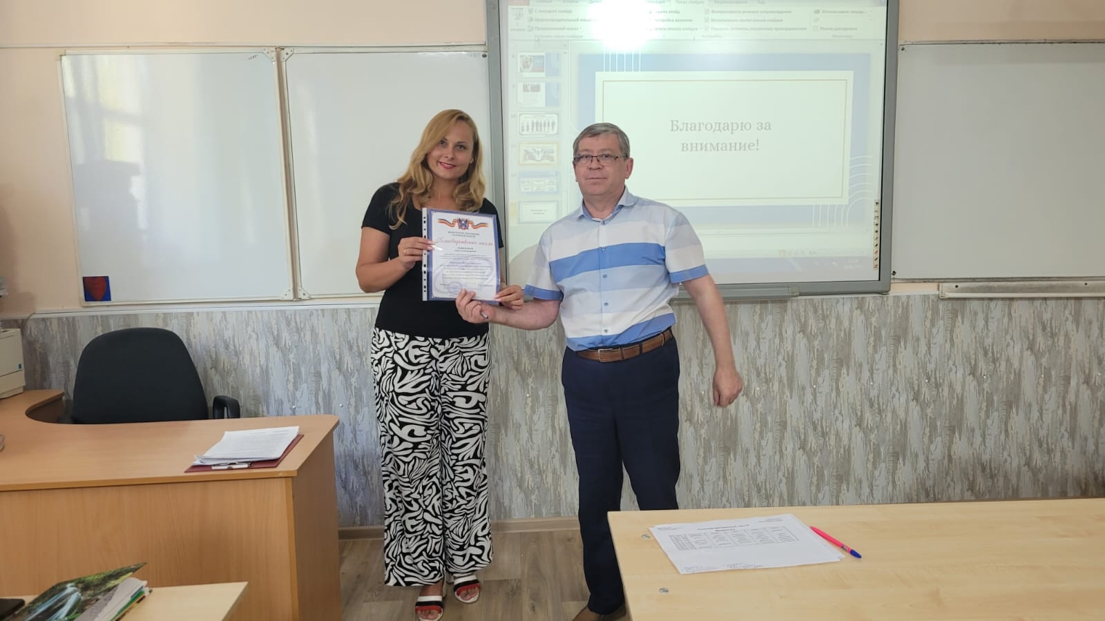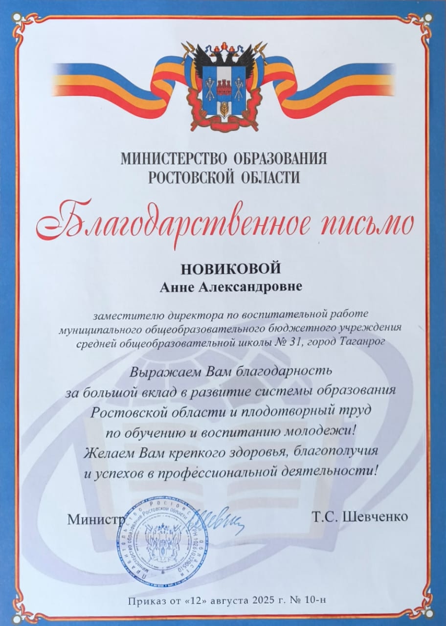 Так же мы гордимся своими учителями. Заместителя директора Новикову А. А. наградили Благодарственным письмом от Министерства образования Ростовской области