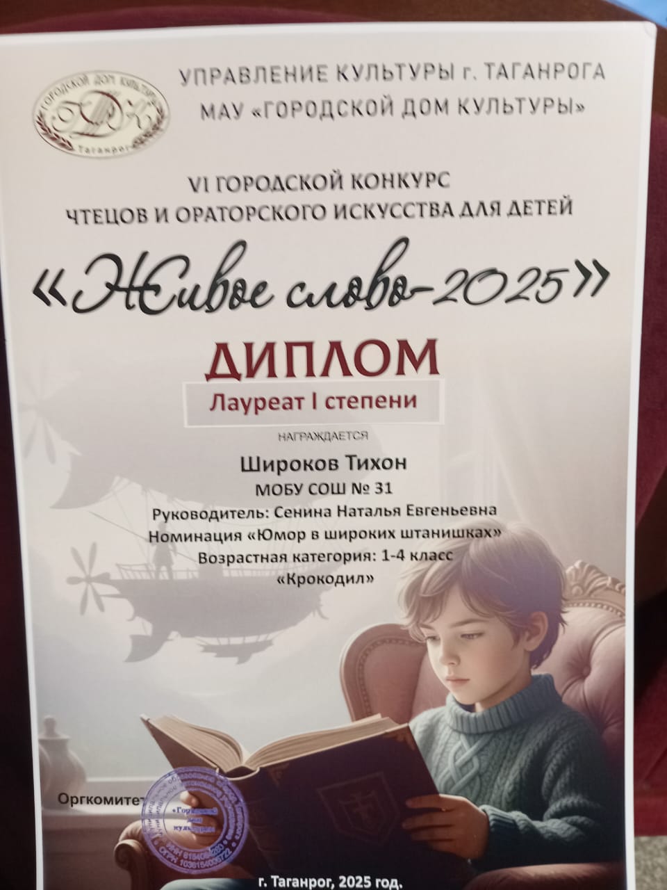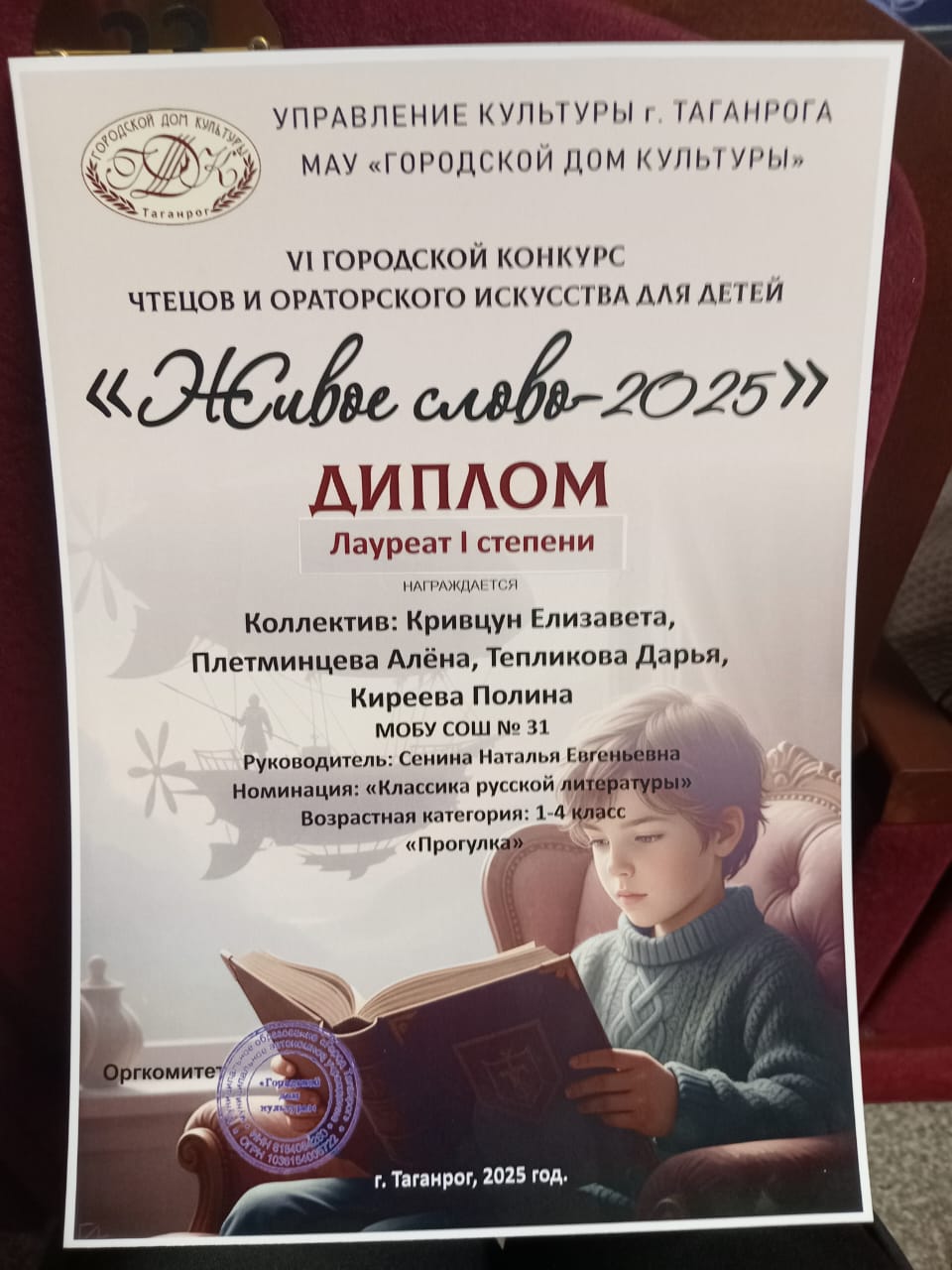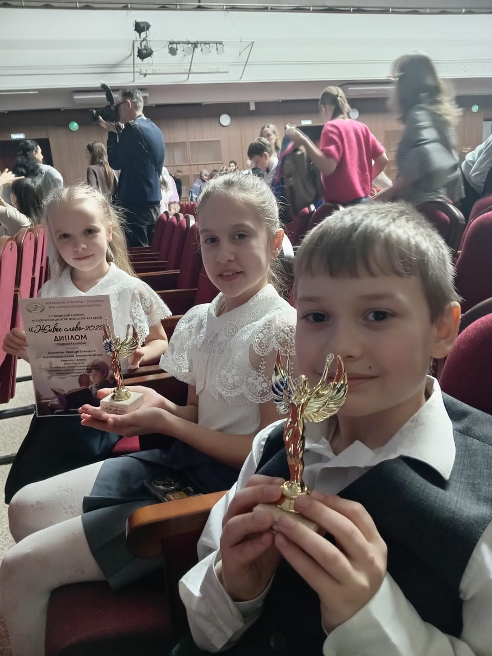Обучающиеся 3 Б класса под руководством Сениной Натальи Евгеньевны приняли участие в VI городском конкурсе чтецов и ораторского искусства для детей «Живое слово — 2025» и заняли два первых места!!!