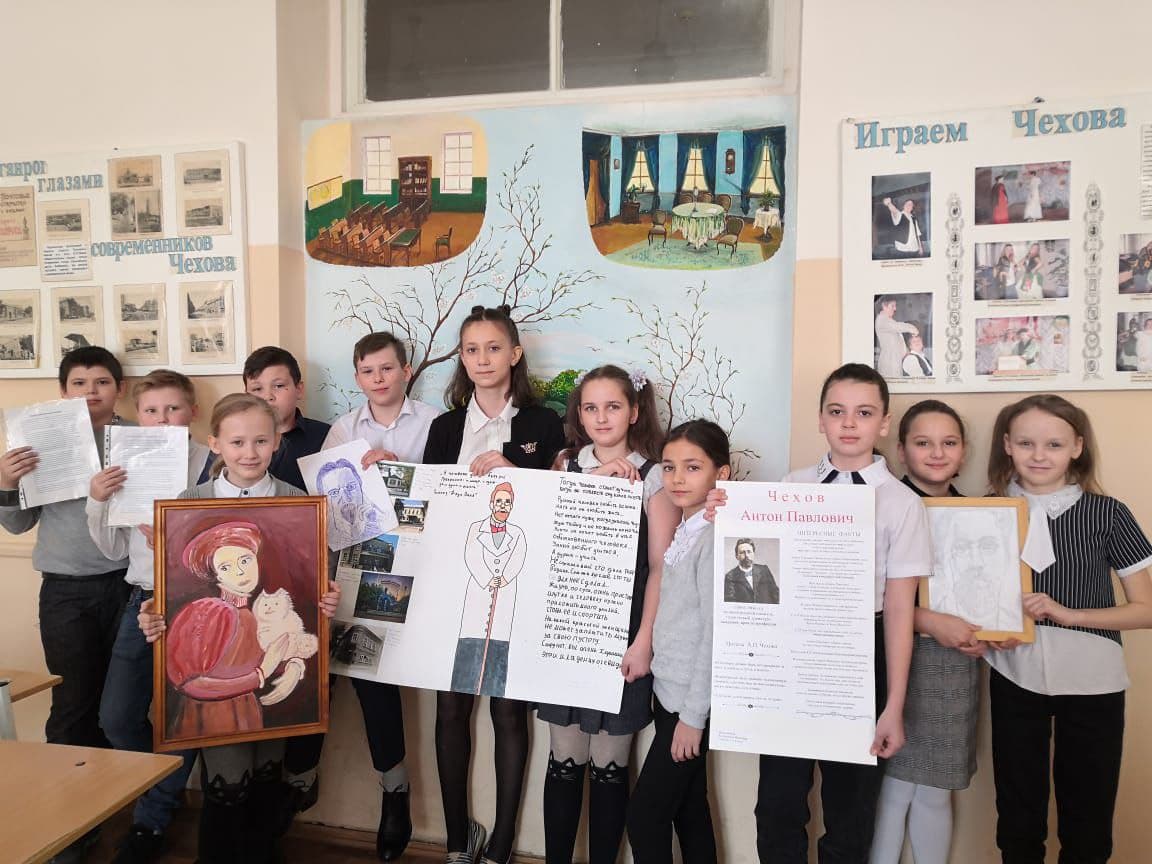 По случаю дня рождения писателя в 5-х классах (учитель русского языка и литературы Поляк М. В.) было проведено внеклассное мероприятие "Наш А. П. Чехов".