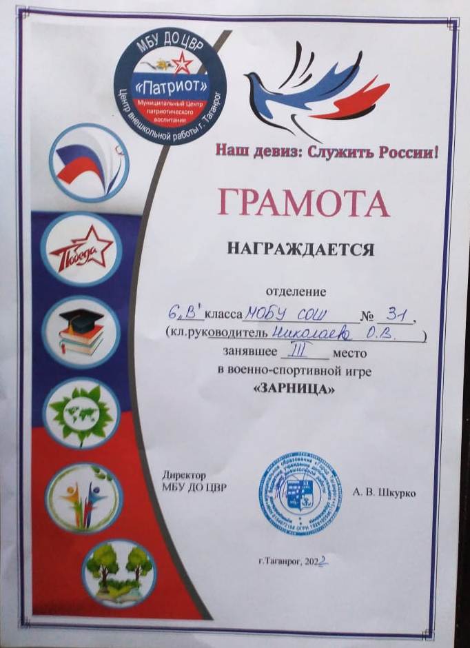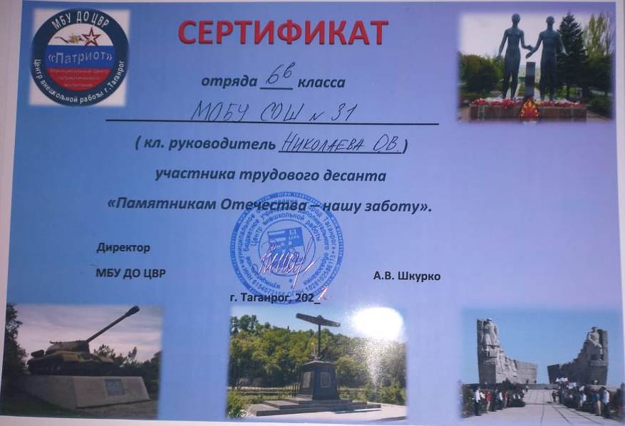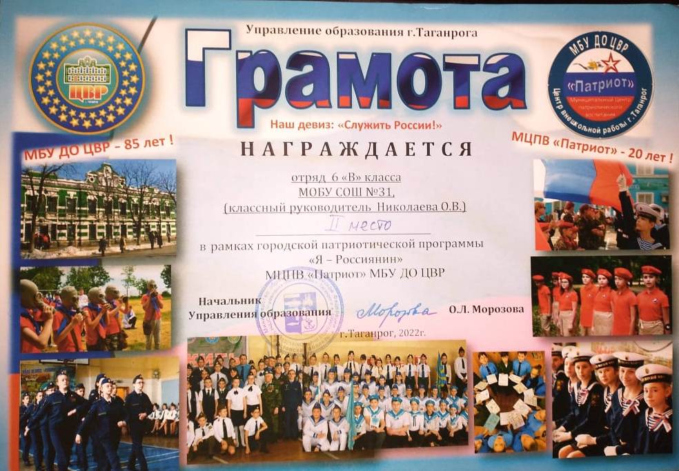 Ребята получили сертификат участника трудового десанта «Памятникам Отечества нашу - заботу», заняли I место в краеведческой игре «Ты живи, Моя Россия! Славься, Родина моя!» в рамках городской патриотической игры «Я - Россиянин» МЦПВ «Патриот». Грамоты за активное участие в краеведческой игре получили Якушева София, Изранова Алиса, Шампарова Татьяна. 6 «В» класс занял II место в рамках городской патриотической программы «Я – Россиянин» МЦПВ «Патриот».